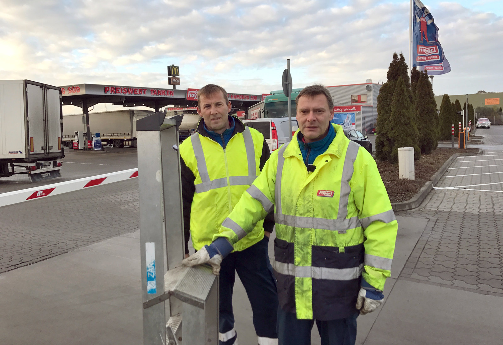 Hausmeister Christian Wolters und Thomas Schulz (rechts) sorgen für einen reibungslosen Ablauf auf dem LKW-Parkplatz.Bild: © NDR/BEZZENBERGER/ENGELS