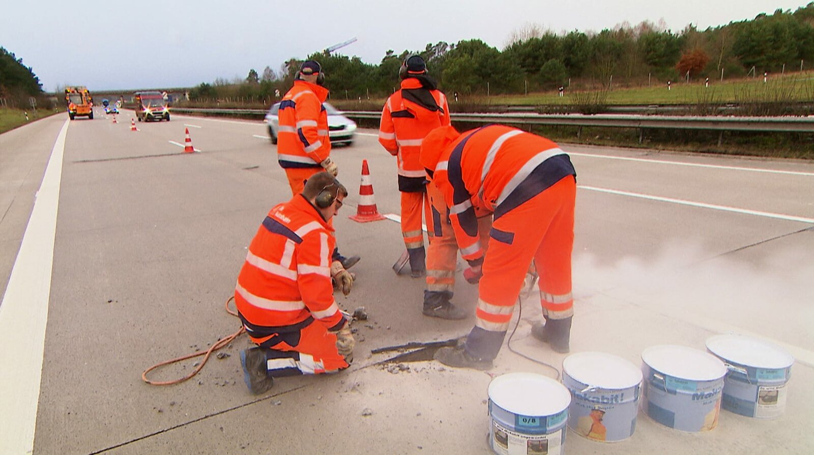 Ausbesserungsarbeiten auf der Autobahn: Die Männer der Autobahnmeisterei Hittfeld sind bei Wind und Wetter im Einsatz für sichere Fahrbahnen und das bei laufendem Verkehr.Bild: © NDR/MfG-Film GmbH und CoKG/Ralf Biehler