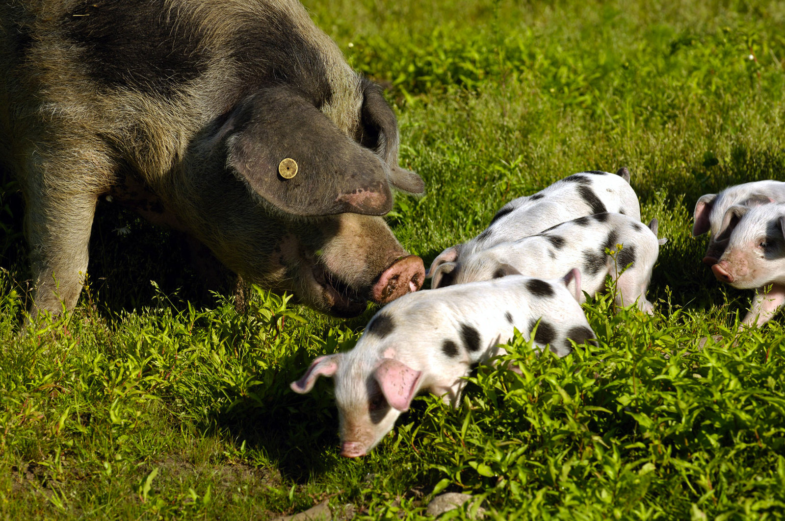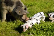 Buntes Bentheimer Schwein mit Ferkeln. Wegen der bunten Flecken waren besonders die Ferkel früher sehr beliebt und ließen sich auf dem Markt gut verkaufen. Heute gibt es nur noch 500 eingetragene Tiere.Bild: © ZDF / © Arche Warder