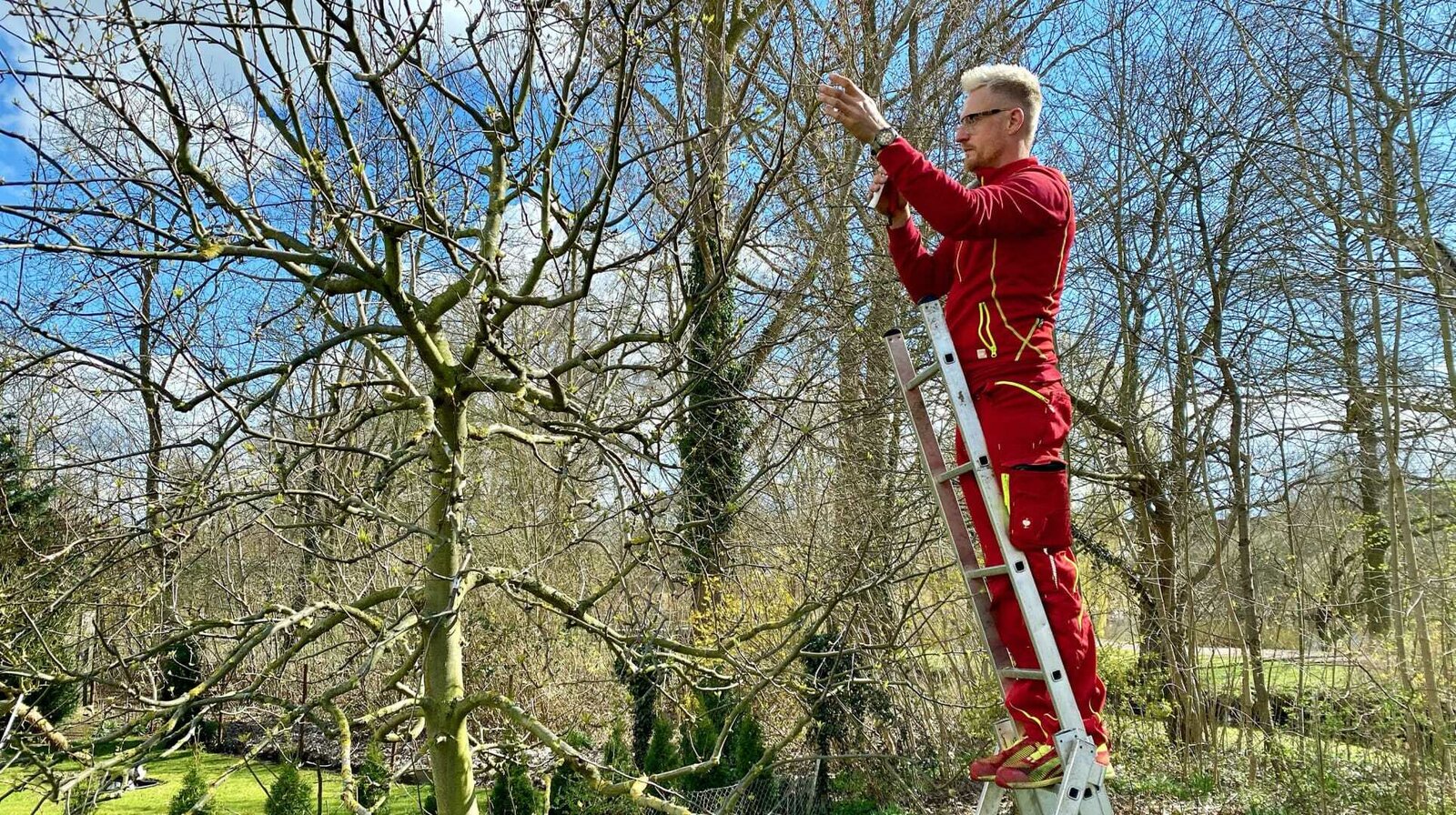 Sind im Garten! - Das große Buddeln nach der WinterpauseToni Neumann, Gärtner und Gartenpfleger, beim Obstbaumschnitt in einem Garten in Wismar.Bild: © NDR/Till Lehmann
