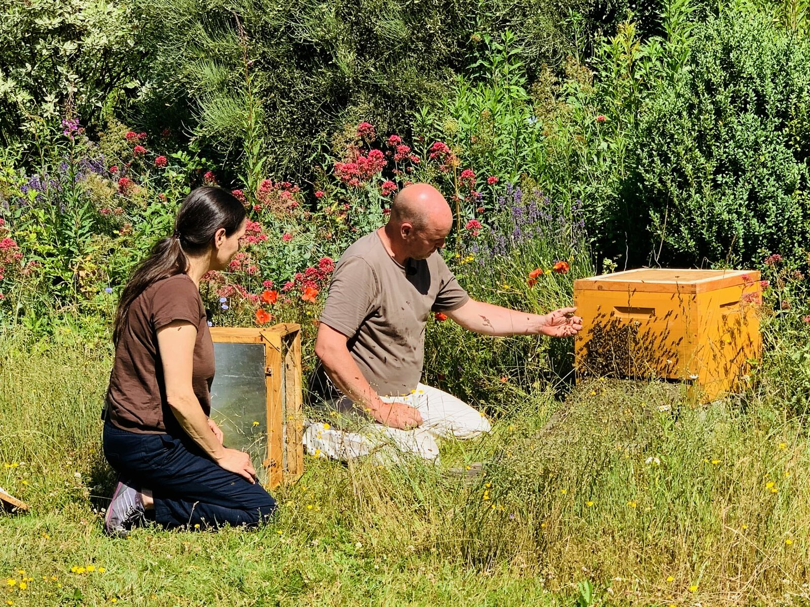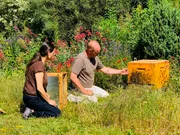 Mit Herz und Seele für die BienenImkerpaar Nena und Christian Eggers lässt Bienenschwarm einlaufen.Bild: © NDR/Katrin Richter
