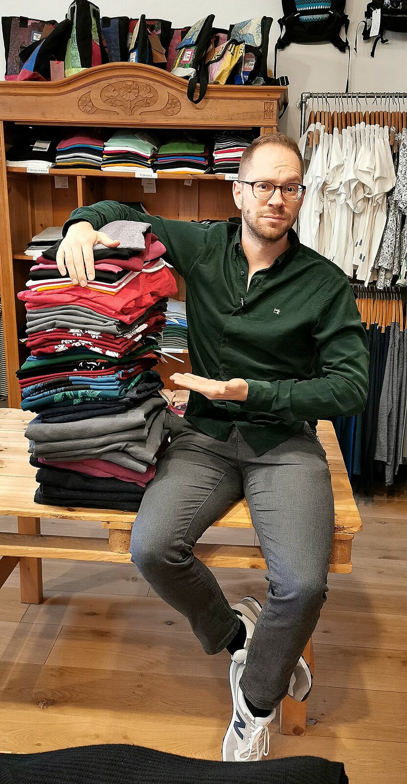 Klamotten & ShoppingTobias Koch neben einem Stapel von 60 Kleidungsstücken, die durchschnittliche Anzahl von Kleudungsstücken, die wir uns jährlich neu kaufen.Bild: © SWR/solisTV