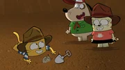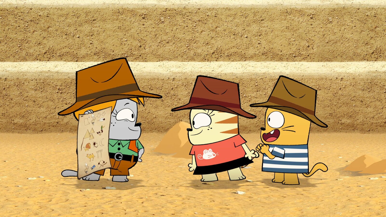 Expedition Ägypten"Die Ollie & Moon Show", "Expedition Ägypten." Ollie bekommt eine Postkarte von seiner Tante Schnurr, die in Ägypten Ausgrabungen durchführen lässt. Sie ist auf der Suche nach dem Juwelen-Schatz eines Pharaos. Prompt fliegt Moon mit Ollie zu ihr, um bei der Schatzsuche zu helfen. Schnurr hat inzwischen ein paar Zeichen entdeckt, die den Weg zu dem Schatz weisen könnten. Und Moon interpretiert sie richtig. Sie ist die geborene Schatzsucher-Katze!Bild: © ORF/Studio 100 Media
