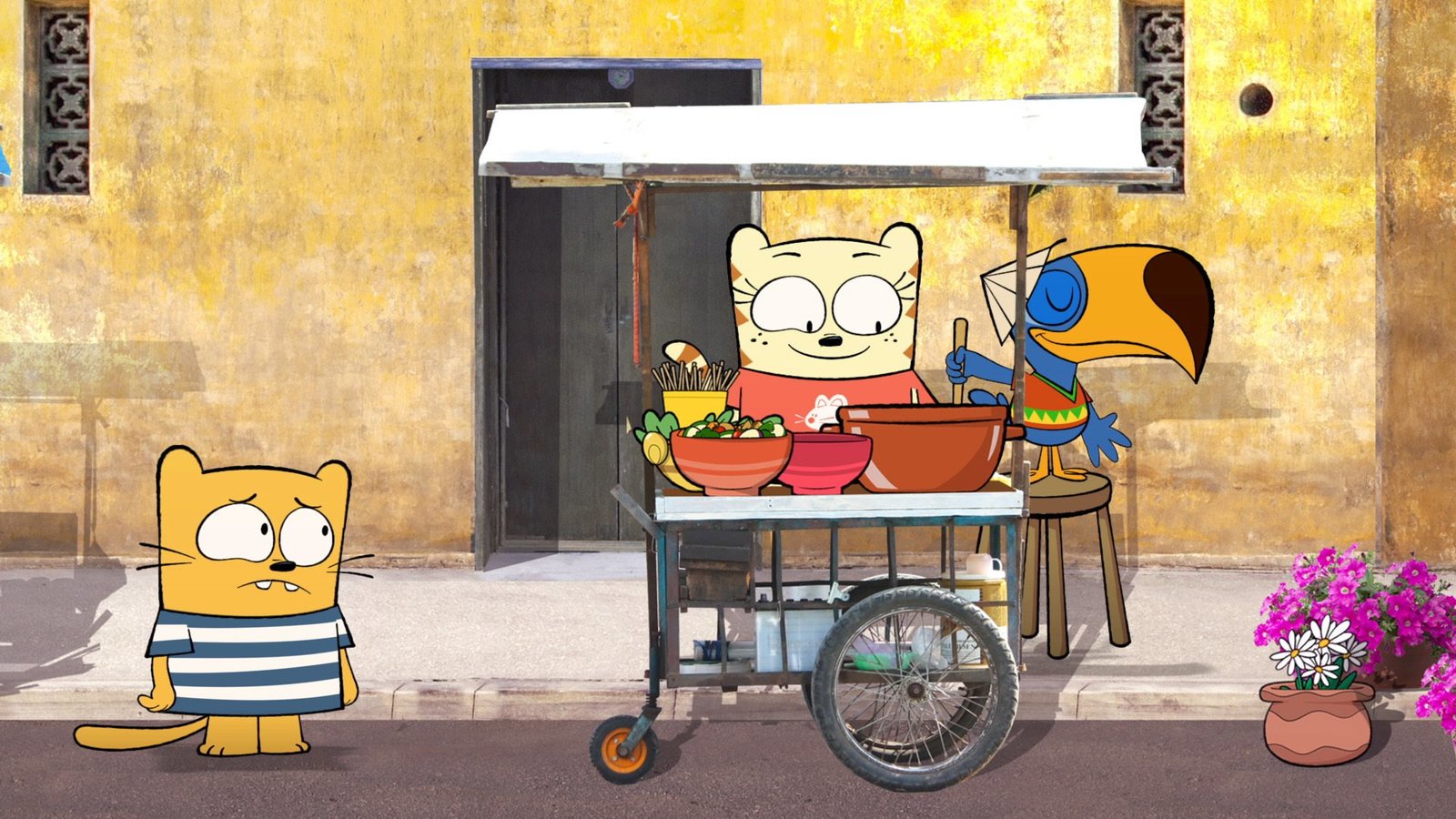 Glasnudel-Gewirr"Die Ollie & Moon Show", "Glasnudel-Gewirr." Ollie ist ein Gewohnheitstier und isst jeden Tag dasselbe. Moon hingegen lässt sich gerne auf kulinarische Abenteuer ein, besonders seit sie die Kochsendung der berühmten Köchin Lorraine verfolgt. Moon gelingt es, Ollie zu überreden, nach Vietnam zu reisen, um dort neue Speisen auszuprobieren. Doch Ollie weigert sich standhaft, selbst einfache Glasnudeln zu essen. Dann treffen die beiden zufällig auf Lorraine.Bild: © ORF 1