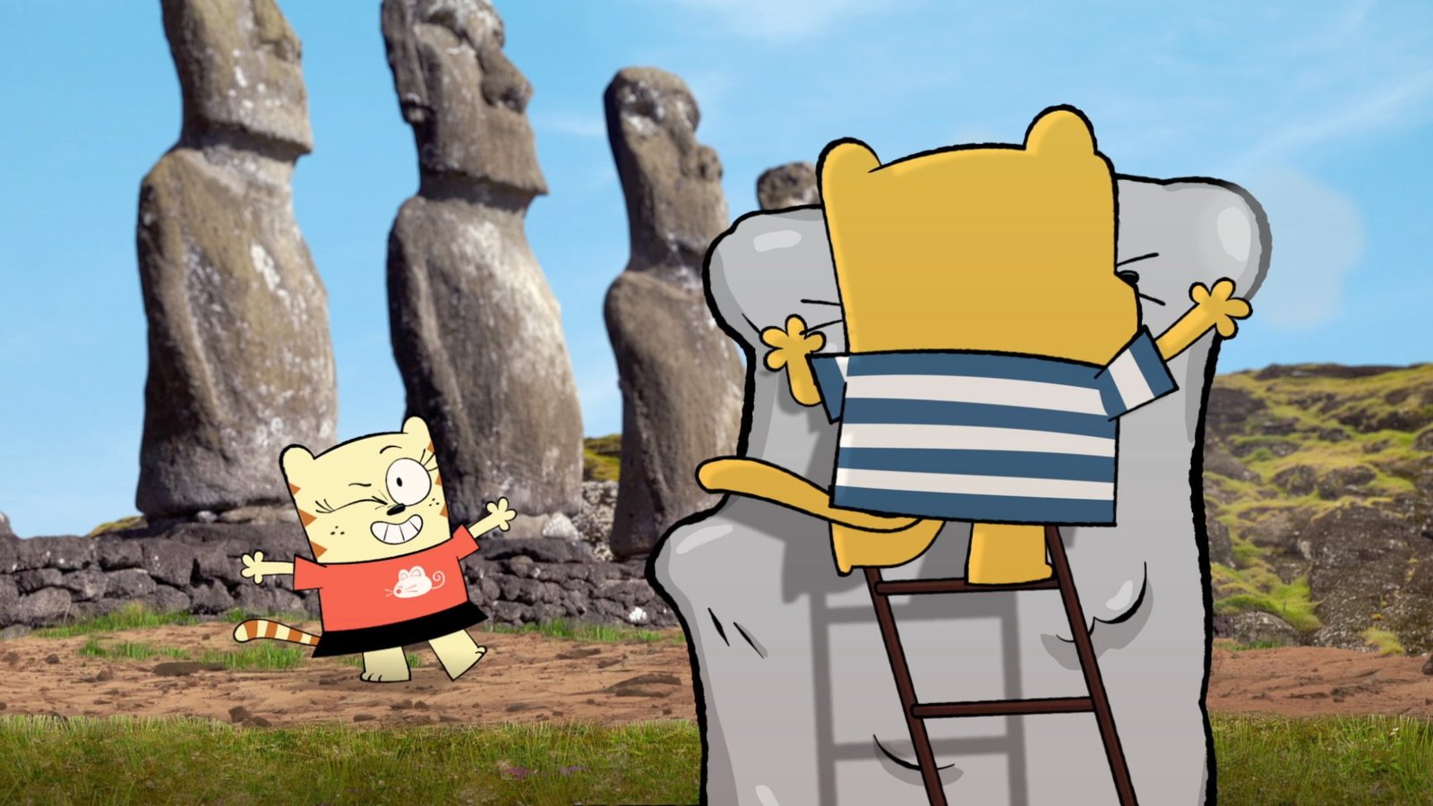 Katze, Kunst & Krise"Die Ollie & Moon Show", "Katze, Kunst & Krise." Ollie und Moon haben Unmengen an Ton gekauft, um Statuen von sich daraus zu formen. Während Moon bereits eine schöne Statue von Ollie modelliert hat, hat Ollie noch nicht einmal angefangen. Ihm ist es wichtig, dass in der Skulptur die Besonderheit des Gezeigten herauskommt. So wie bei den berühmten Statuen auf der Osterinsel. Kurzerhand reisen die beiden auf die besagte Insel, um sich inspirieren zu lassen.Bild: © ORF 1