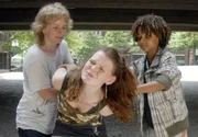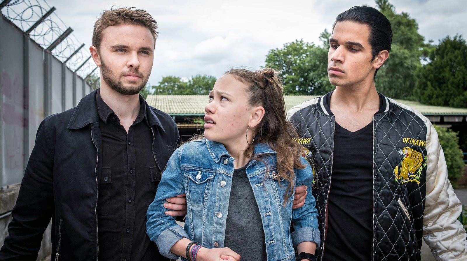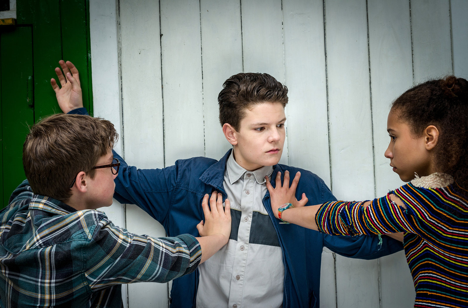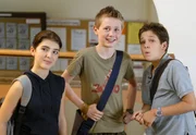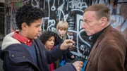Der Apfel fällt nicht weit vom StammBenny (Ruben Storck, links) und Lisha (Emma Roth, rechts) knöpfen sich Thorsten (Julius Strömer) vor.ÂBild: © NDR/Boris Laewen