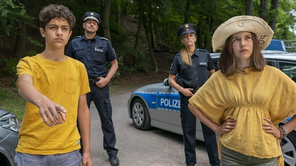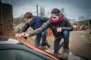 Giftige FässerTarun und Matilda (rechts) stoppen gemeinsam mit der Polizei das verdächtige AutoBild: © NDR/Letterbox Filmproduktion/Boris Laewen