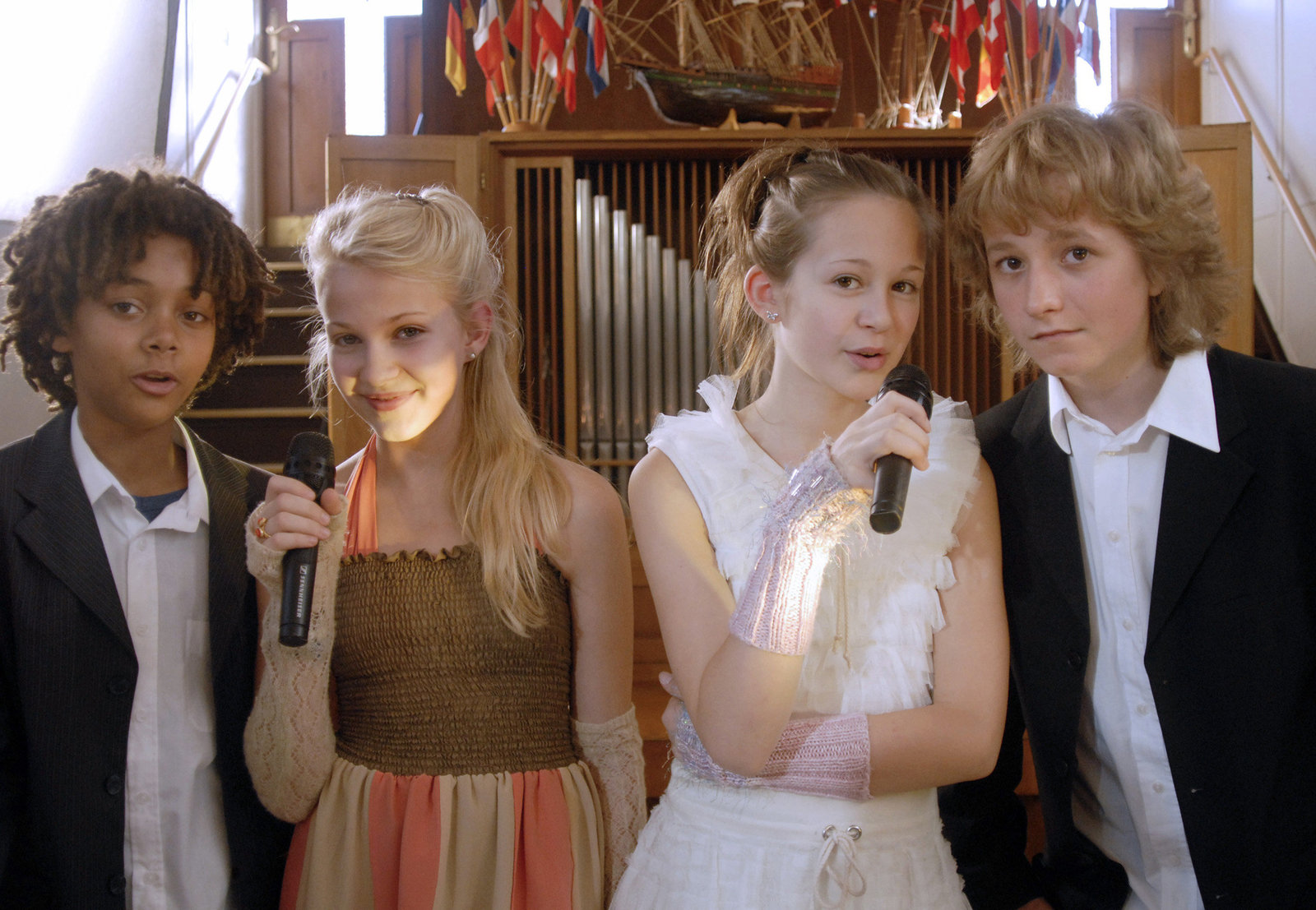 Hochzeit in GefahrThemba (Coco Nima, li.), Sophie (Katherina Unger), Lina (Lale H. Lange, 3.v.l.) und Rasmus (Julian Winterbach, re.) singen dem Brautpaar ein Ständchen.Bild: © NDR/Romano Ruhnau