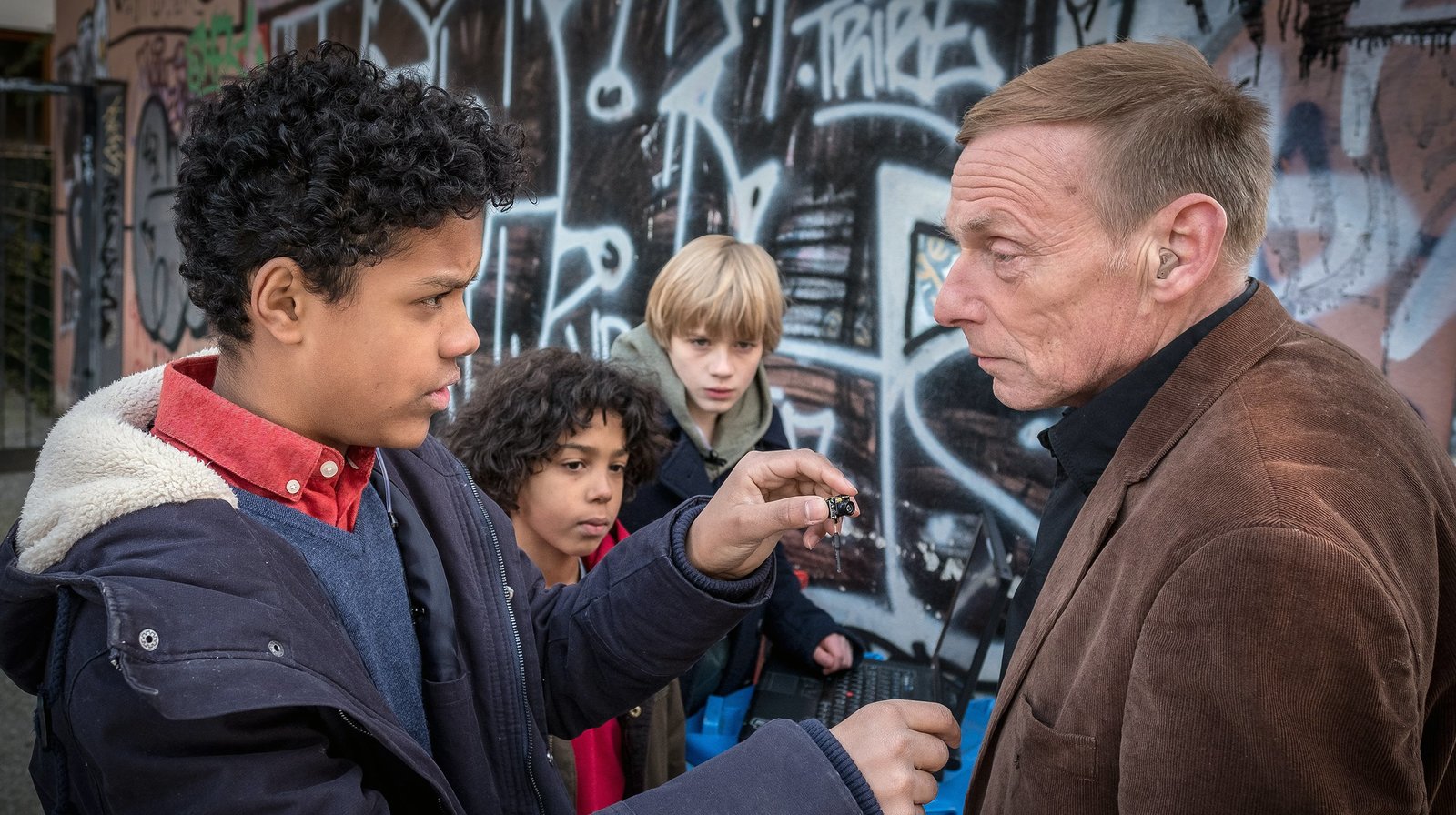 Käufliche IntelligenzDie Pfefferkörner Emma (Aurelia Stern), Sophie (Katherina Unger), Themba (Coco Nima) und Rasmus (Julian Winterbach) kämpfen mit dem Dealer Hanno (Ludwig Trepte, Mitte).Bild: © NDR/Romano Ruhnau
