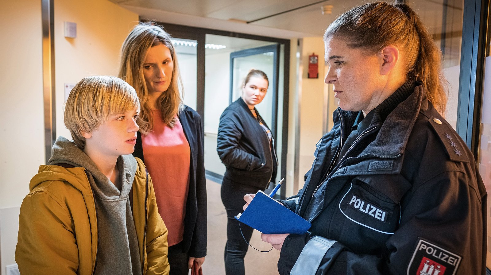 Waschbär und KaninchenLevin (Moritz Pauli, li.) ist ein wichtiger Zeuge für die Polizei - Lucia (Amber Bongard) lauscht im Hintergrund.Bild: © NDR/Boris Laewen