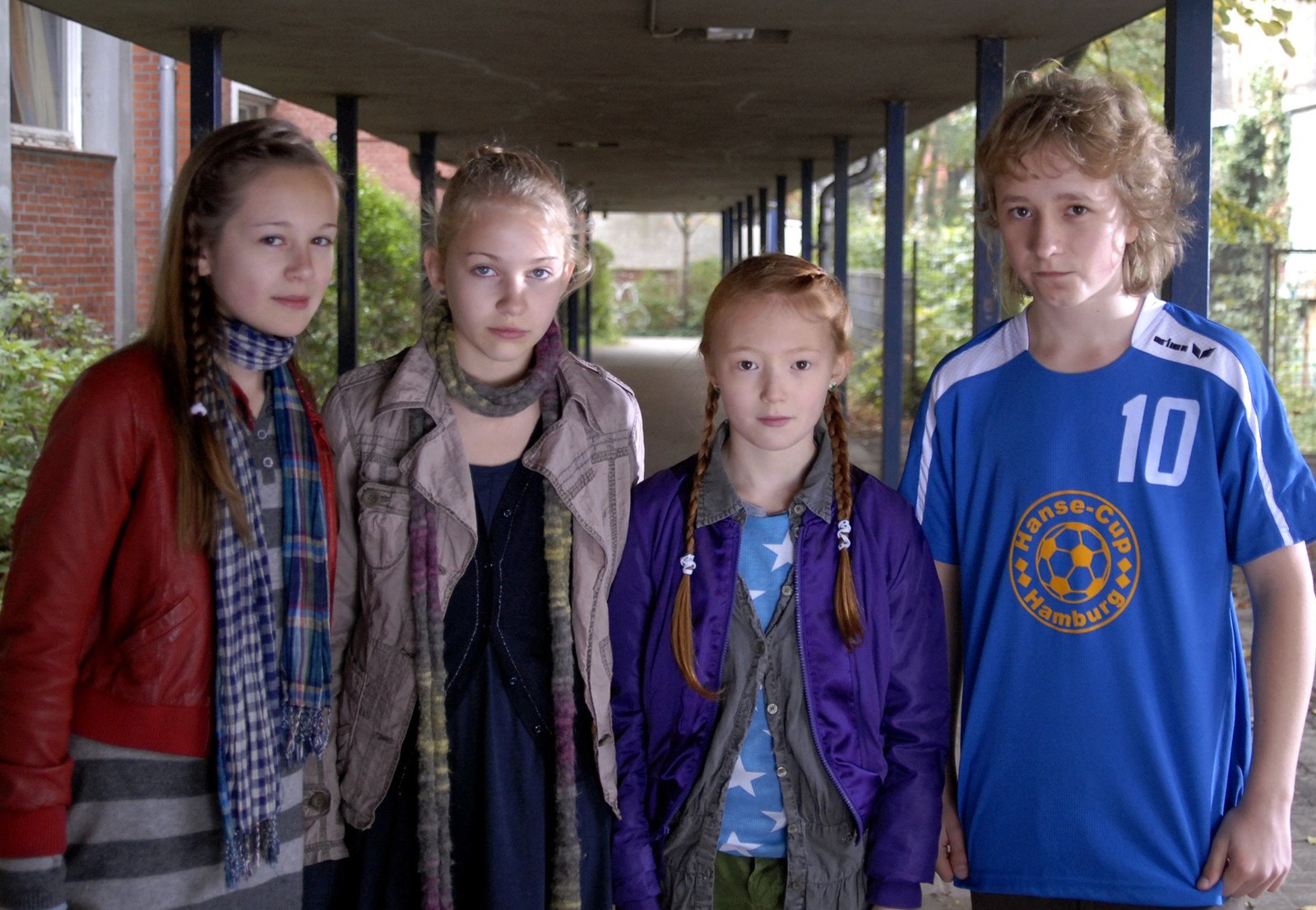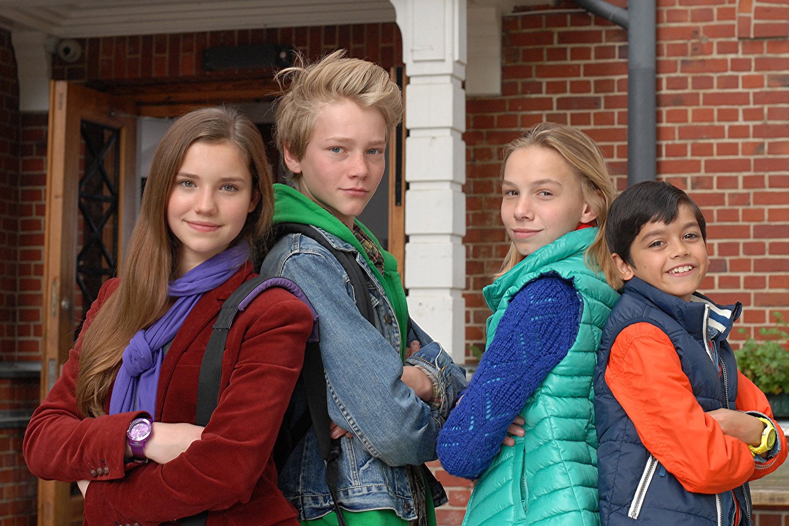 EigentorDie Pfefferkörner-Freunde Lina (Lale H. Lange, li.), Sophie (Katherina Unger, 2.v.li.), Emma (Aurelia Stern, 3.v.li.) und Rasmus (Julian Winterbach, re.) helfen Themba.Bild: © NDR/Romano Ruhnau
