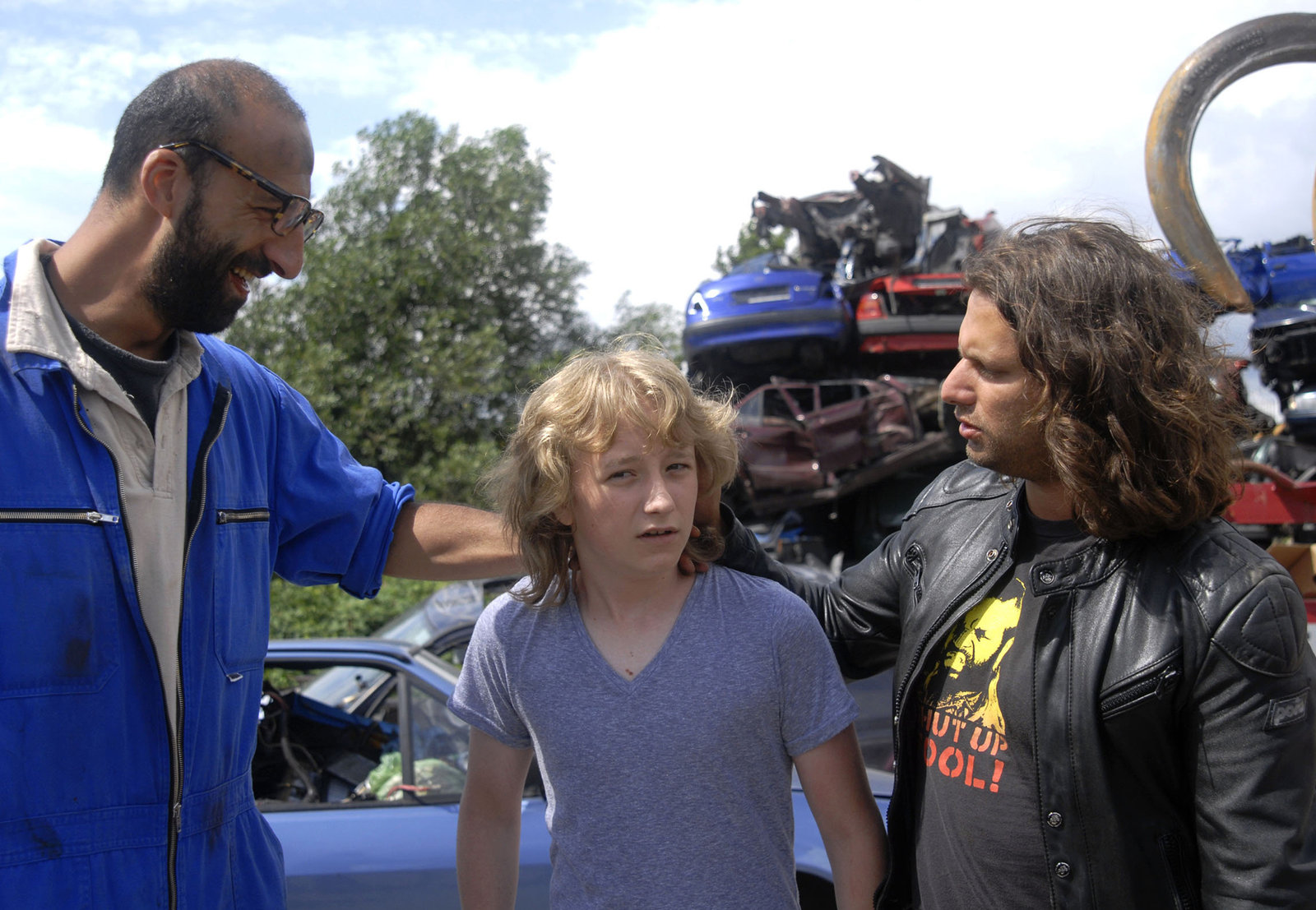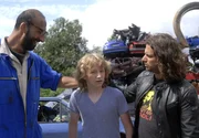 ReisefreudenRasmus (Julian Winterbach, Mitte) bekommt es mit den zwielichtigen Schrottplatz-Brüdern Panos (Badasar Calbiyik, li.) und Miltos (Adam Bousdoukos, re.) zu tun.Bild: © NDR/Romano Ruhnau