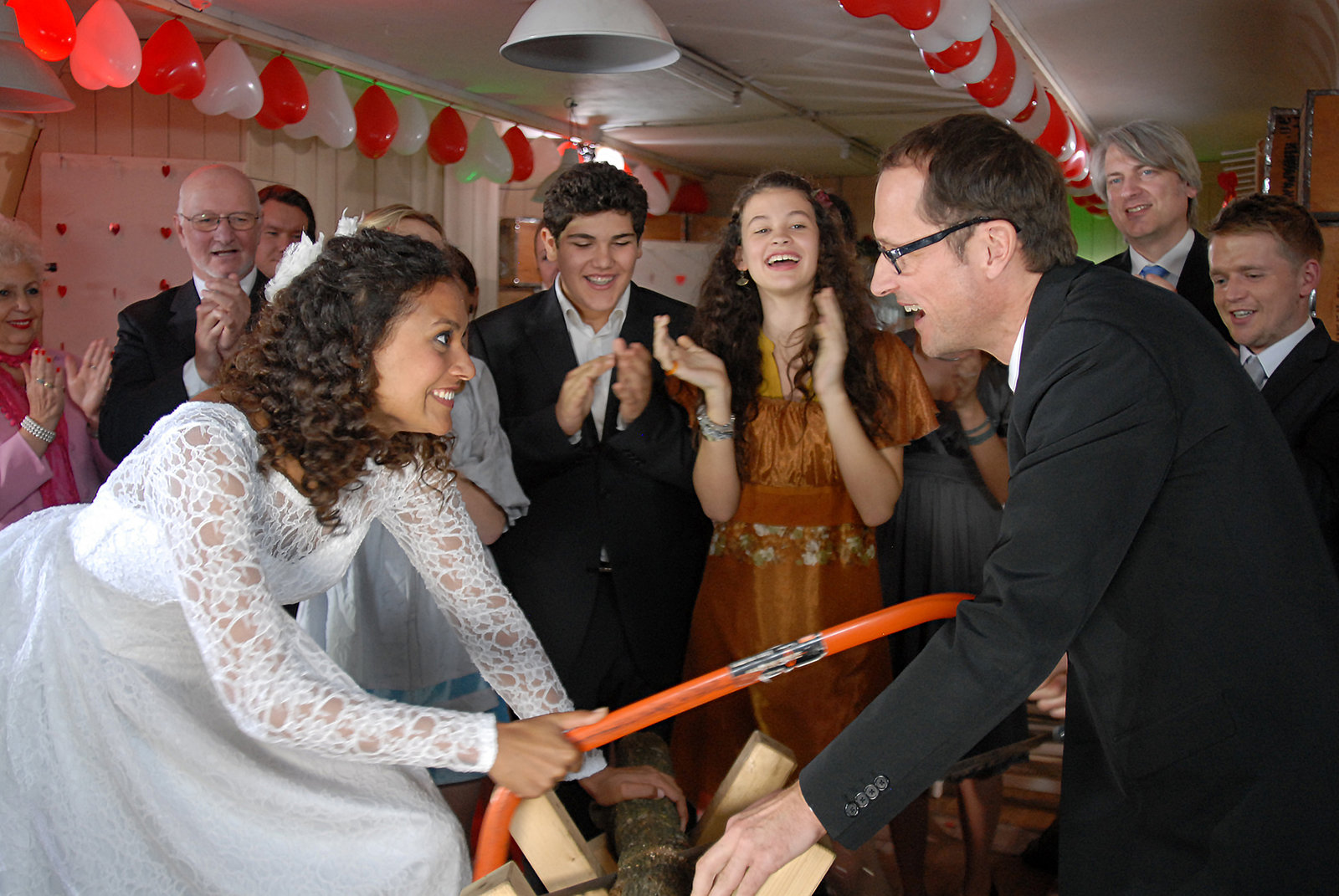 Endlich HochzeitIsabell (Lucia Peraza Rios) und Alexander (Markus Knüfken) haben Spaß auf ihrer Hochzeit im Hauptquartier.Bild: © NDR/Romano Ruhnau