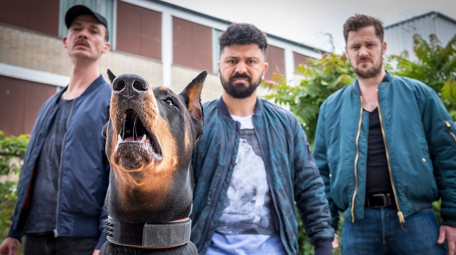 Die falsche SchlangeSchlangenliebhaber Gisbert (Tarik Sanli, Mitte) hofft, dass Benny (Ruben Storck) es schafft, seine Boa Constrictor vor den fiesen Drogenkurieren Roland (Bastian Reiber, 2. von rechts) und Sergio (Jonas Hien, ganz rechts) zu retten.Bild: © NDR/Boris Laewen