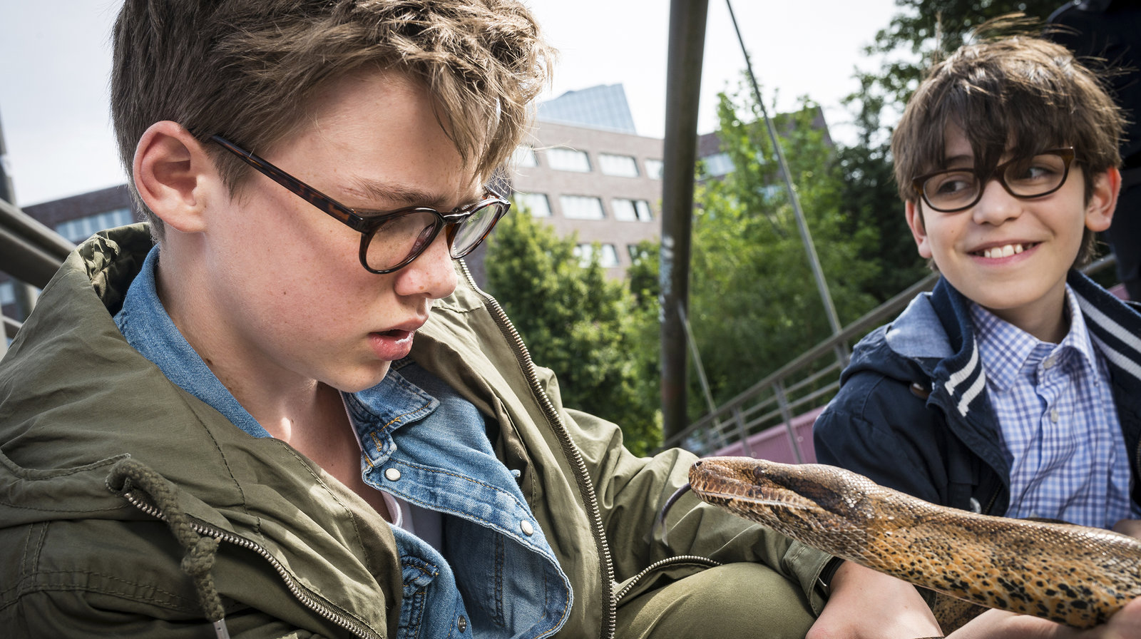Die falsche SchlangeSo ein richtiger Schlangenfreund wird Benny (Ruben Storck, links) trotz des guten Zuredens von Gisbert (Tarik Sanli) nicht.Bild: © NDR/Boris Laewen