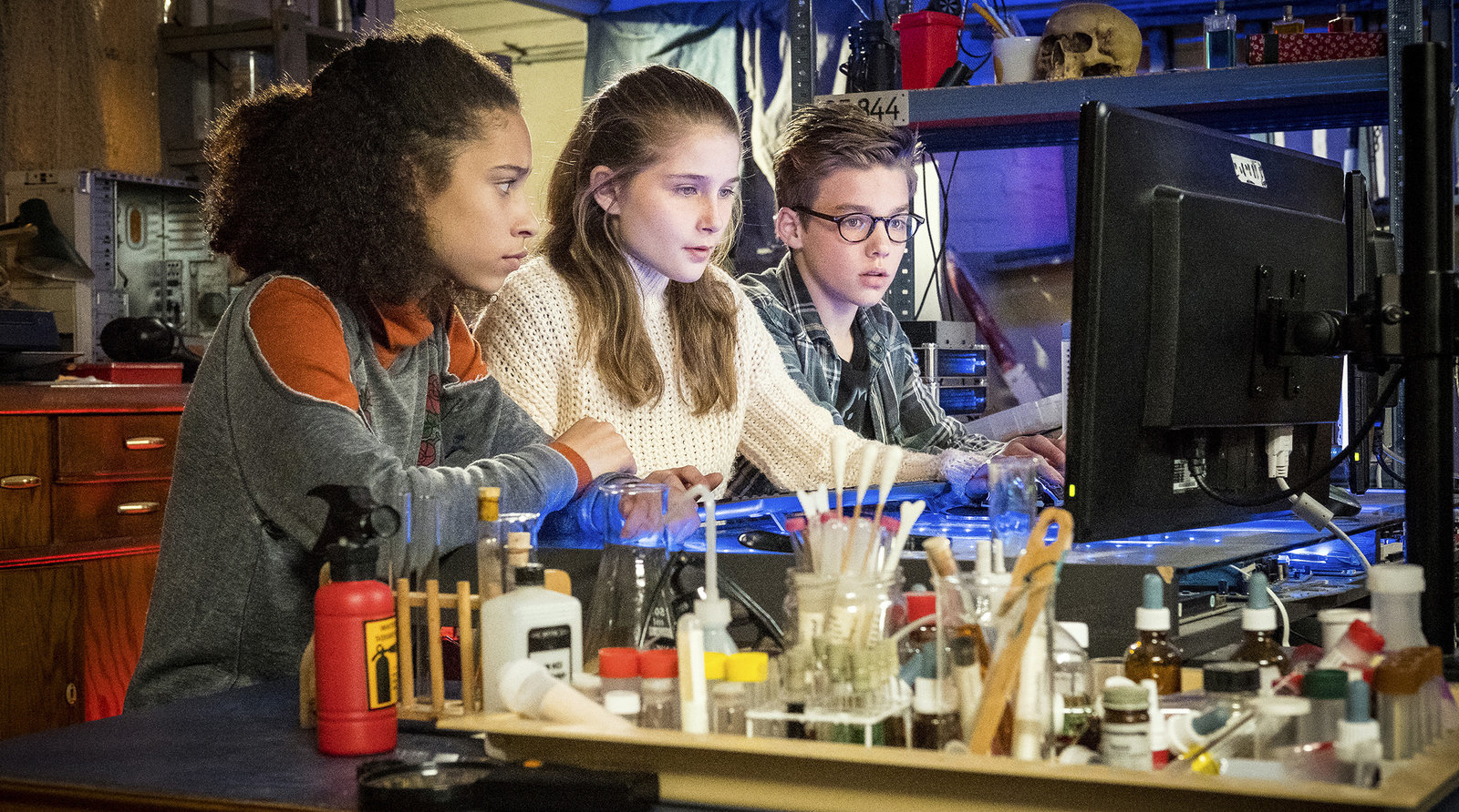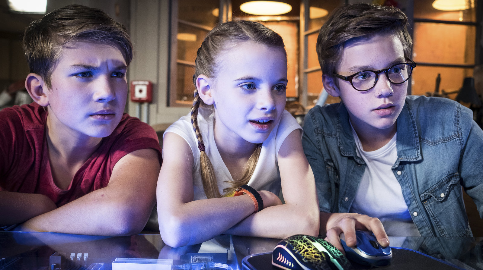 Nächstes LevelLisha (Emma Roth, links), Mia (Marleen Quentin, mitte) und Benny (Ruben Storck, rechts) recherchieren im Netz alles über das Onlinespiel „Drachenarena“.ÂBild: © NDR/Boris Laewen