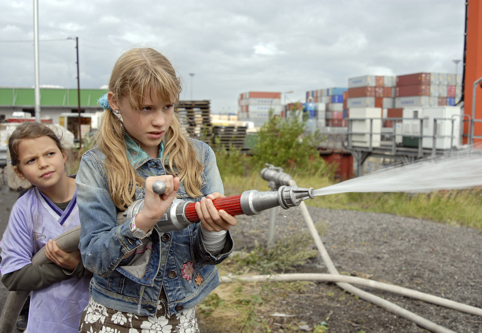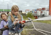 Ein neuer AnfangMarie und Yeliz (Nina Flynn, Laura Gabriel, v.li.) schlagen die Computerdiebe mit einem Feuerwehrschlauch in die Flucht.Bild: © NDR/Romano Ruhnau