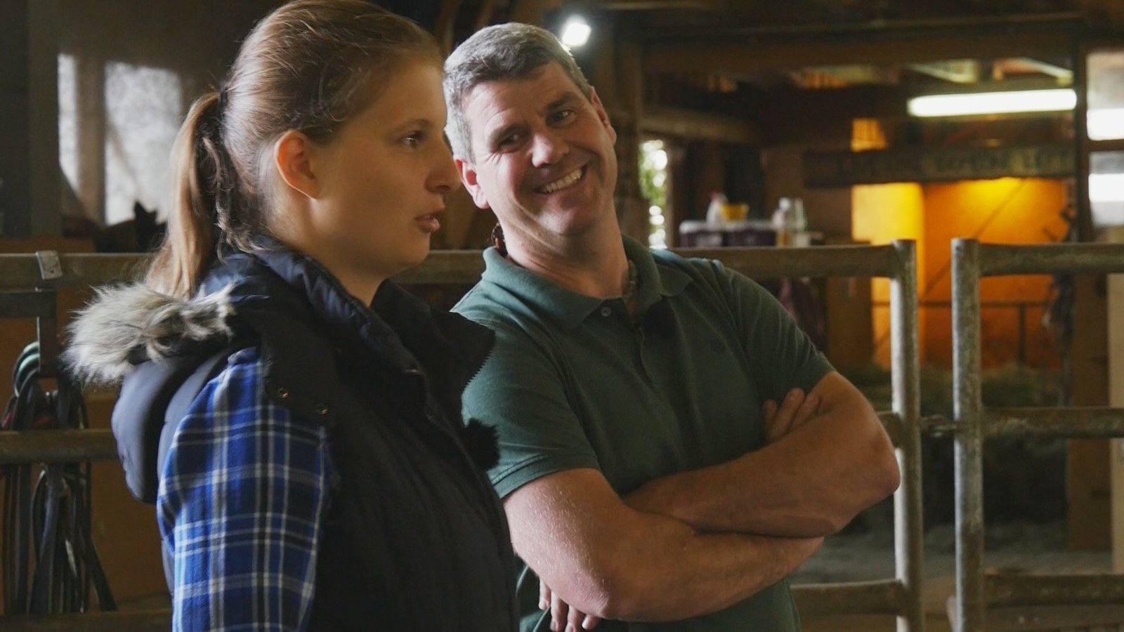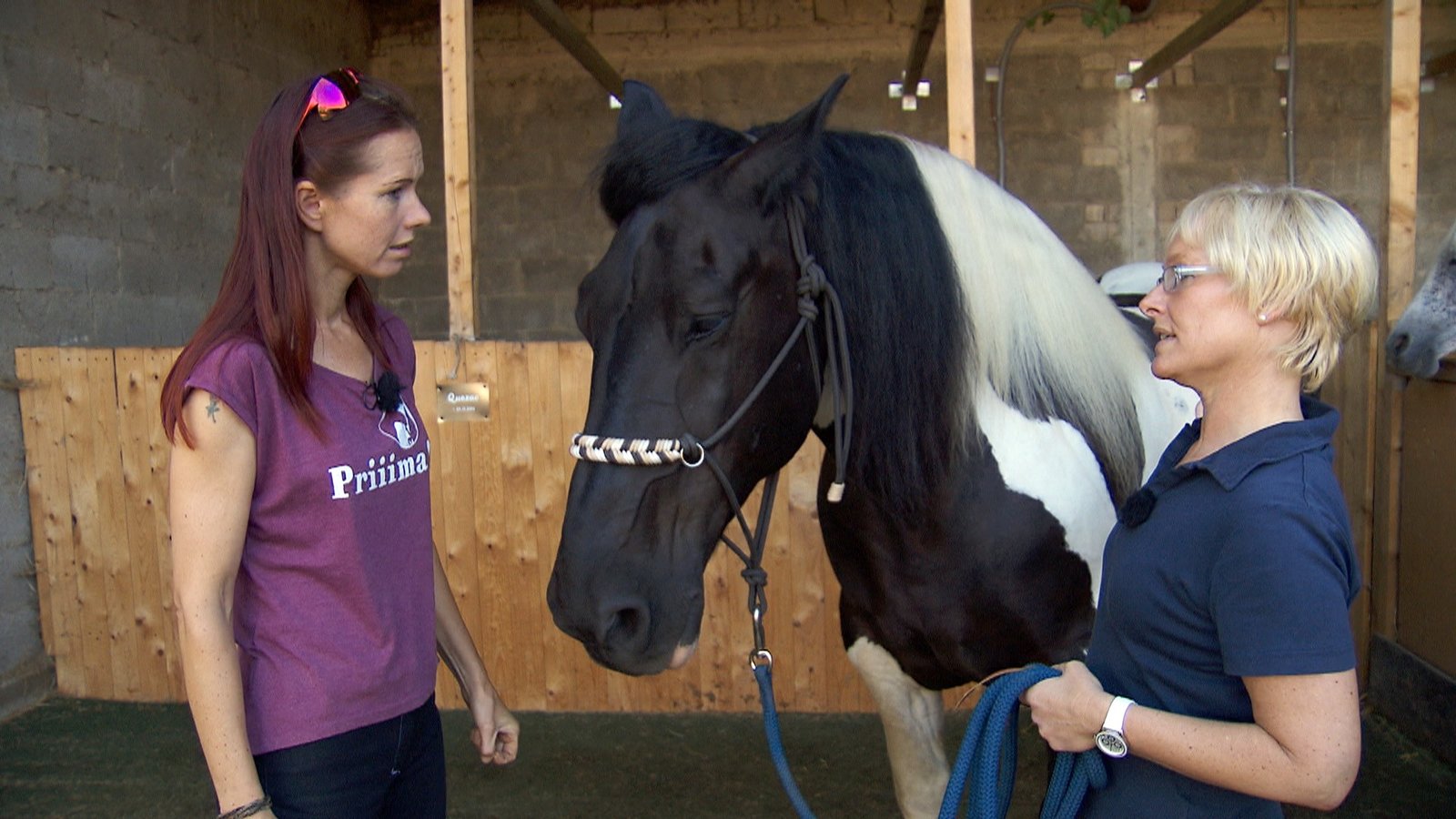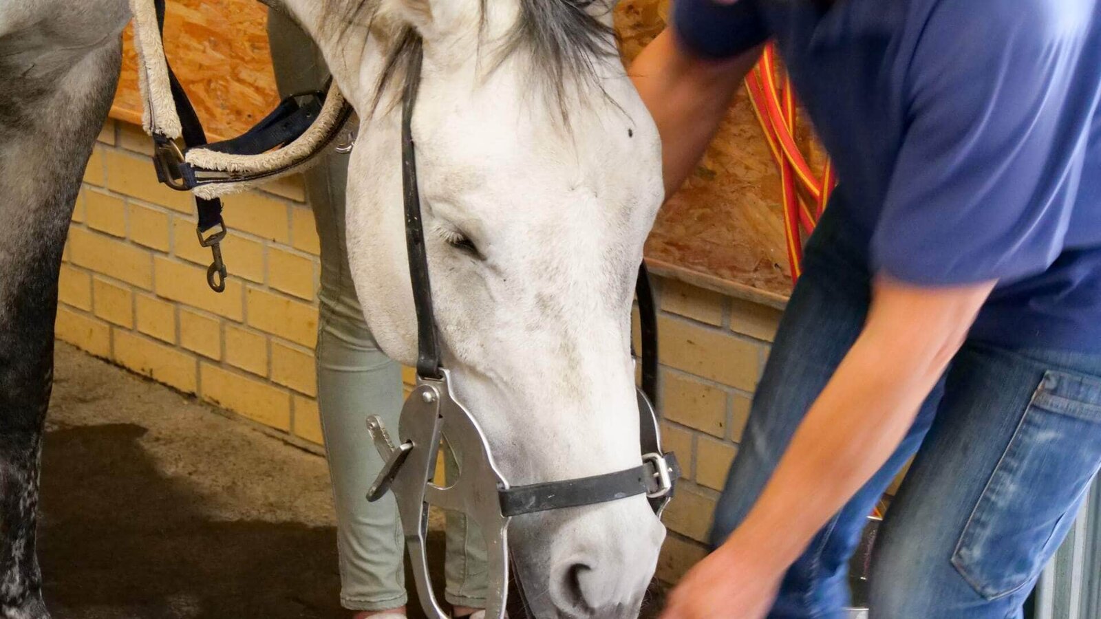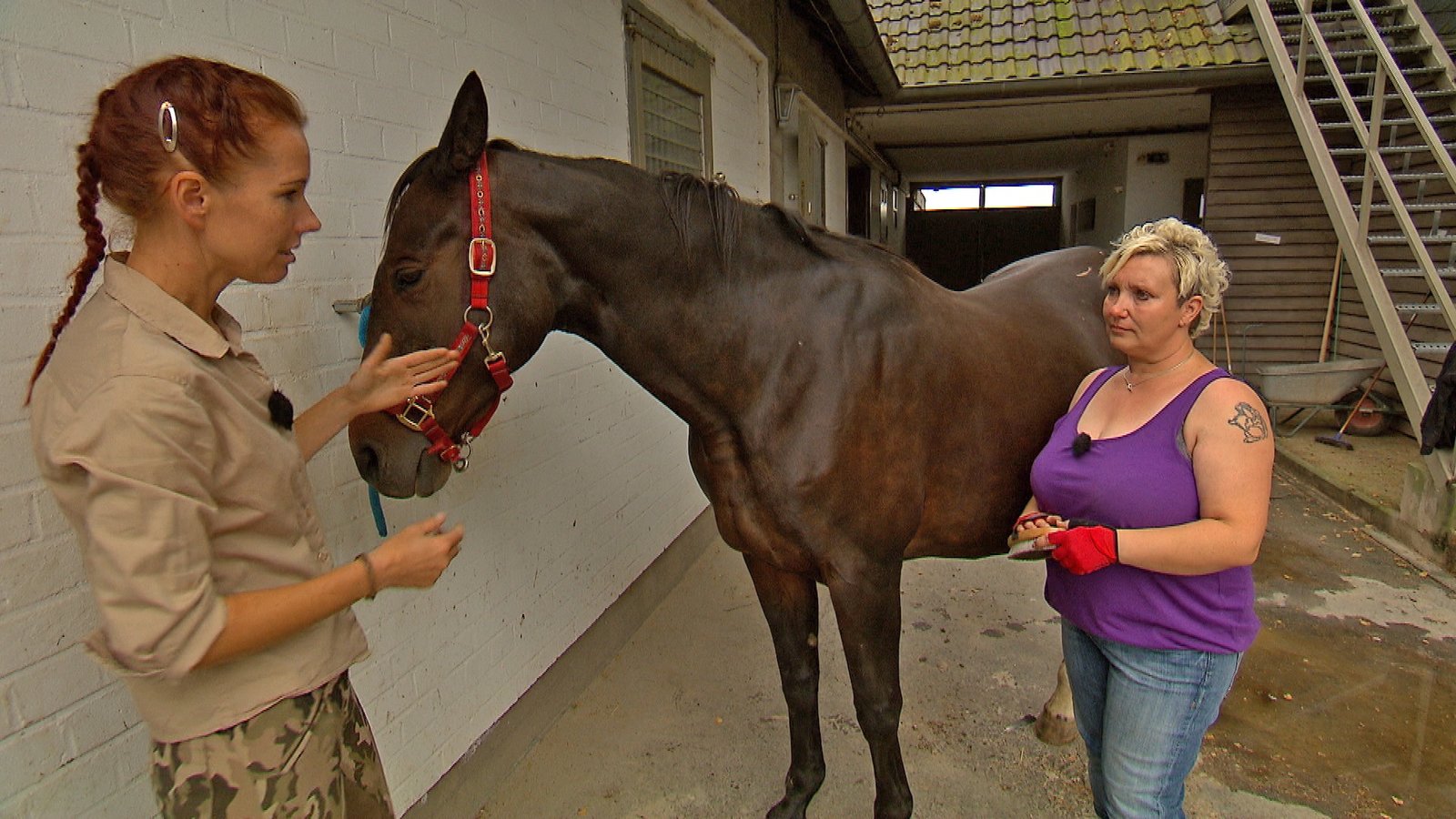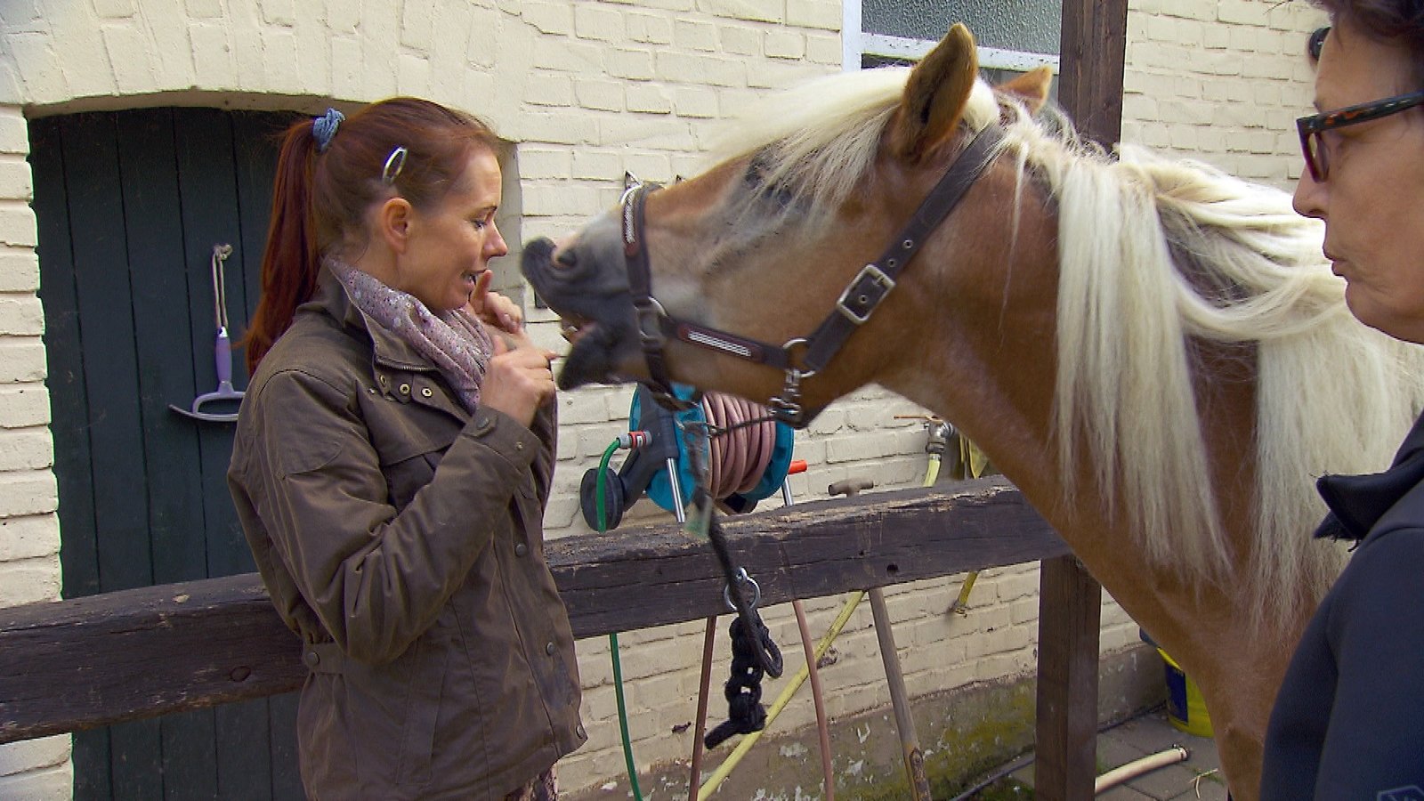 Katharina mit Schimmel Calimero / Jenny mit Freiberger UlliCalimero und Hartmut Schmidt bei der Behandlungsvorbereitung.Bild: © TVNOW / Mina TV