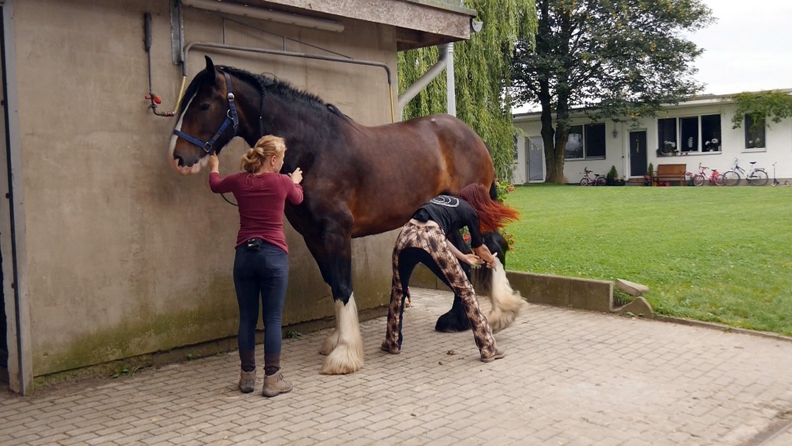 Sabrina Bockes und "Thorin" / Nadine Junge und Shire Horse-Stute "Bella""Bella", Sandra Schneider (r.) und Praktikantin Julia üben das Hufegeben!Bild: © VOX / Mina TV