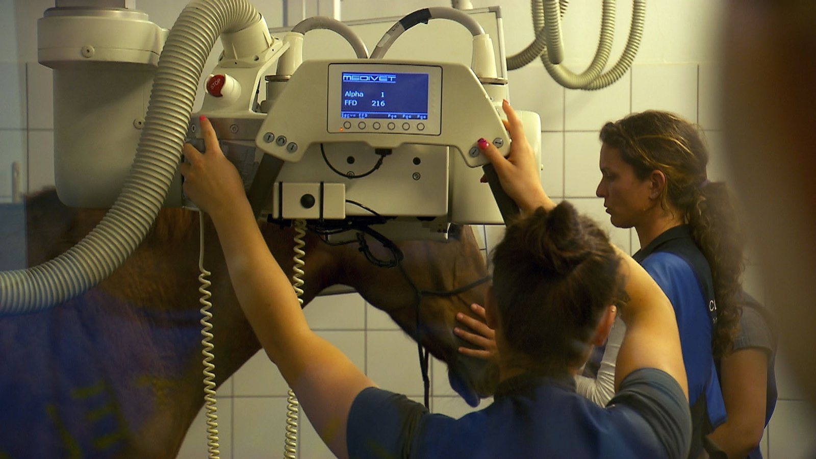 Connemara-Mix "Hidalgo" / Stute "Emmy Lou"Physiotherapeutin Claudia Neeff (vorne) mit "Emmy Lou" in der Pferdeklinik Leichlingen beim Röntgen.Bild: © MG RTL D / Mina TV