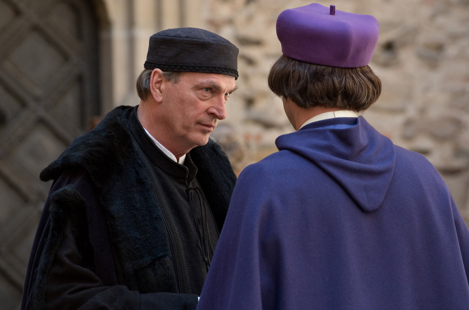 Aus dem FeuerJakob Fugger (Herbert Knaup, li). denkt wie ein moderner Geschäftsmann. Obwohl er die Machenschaften der katholischen Kirche als Machtspiel entlarvt und das grausame Vorgehen der Inquisition abstößt, verhandelt er im Hintergrund mit Hilfe seines finanziellen Einflusses. Einem Puppenspieler gleich zieht er unbemerkt die Fäden.Bild: © ARD Degeto/Ziegler Film/Václav Sadílek