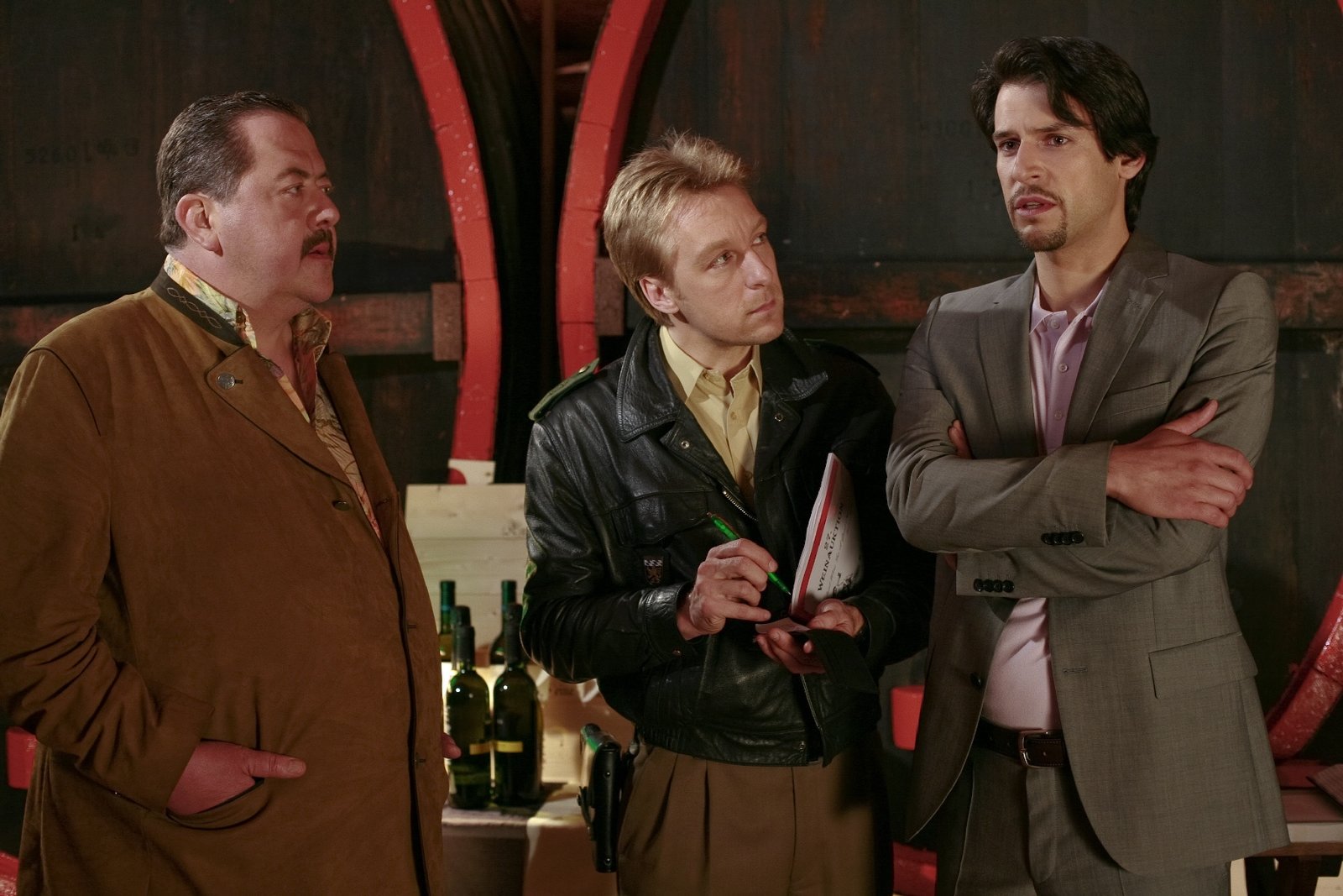 Ein MordsjahrgangFerdl Kreuzeder (Florian M. Odendahl, r.) behauptet gegenüber Korbinian Hofer (Joseph Hannesschläger, l.) und Michael Mohr (Max Müller), dass eine wertvolle Flasche gestohlen wurde. Sollte ein Einbrecher der Mörder sein?Bild: © ZDF und Christian Riege