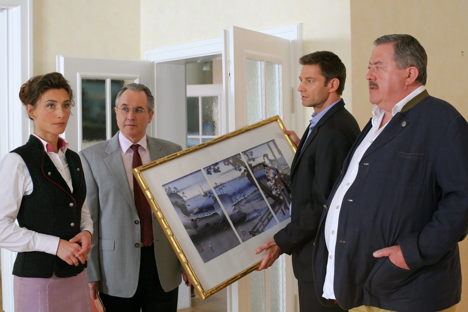 Ein Smoking zum SterbenDie Kommissare Hansen (Igor Jeftic, 2.v.r.) und Hofer (Joseph Hannesschläger, r.) verdächtigen Isolde Richter (Daniela Kiefer, l.), ein wertvolles Bild in der Villa des Opfers entwendet zu haben. Hat Anwalt Fischbach (Norbert Heckner, 2.v.l.) davon gewusst?Bild: © ORF 2