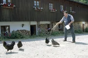 Alarm für eine KuhVor Dienstantritt versorgt Korbinian seine Hühner (Josef Hannesschläger).Bild: © ORF 2
