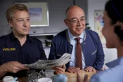 Tödlicher SchlafDer Geschäftspartner des Toten, Georg Huber (Miguel Abrantes Ostrowski, l.), wird von den Kommissaren Stadler (Dieter Fischer, r.) und Bach (Patrick Kalupa, M.) befragt. Kann er zur Aufklärung des Mordfalls beitragen?Bild: © ZDF/Bojan Ritan