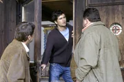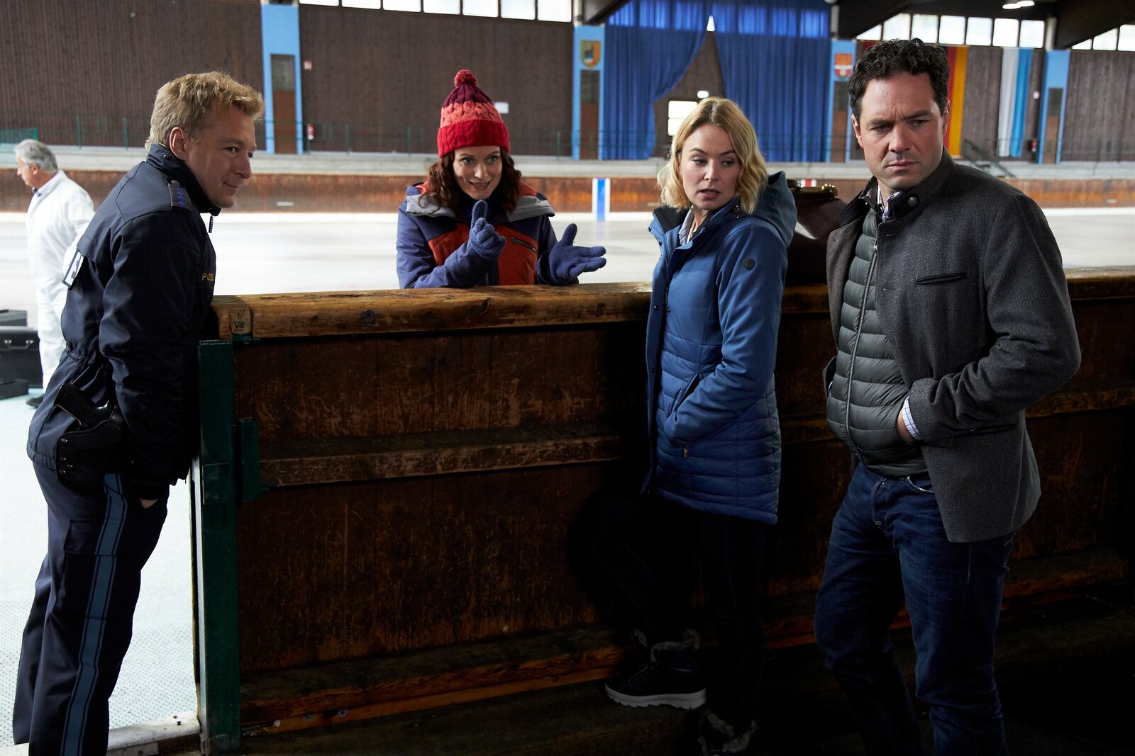 Der Tod kam auf KufenUli Bär (Tom Beck, mi.), genannt der Eisbär, fällt aus allen Wolken, als die beiden Rosenheim-Cops Lind (Tom Mikulla, li.) und Hofer (Joseph Hannesschläger) plötzlich vor der Türe seines Verstecks stehen.Bild: © ORF 2