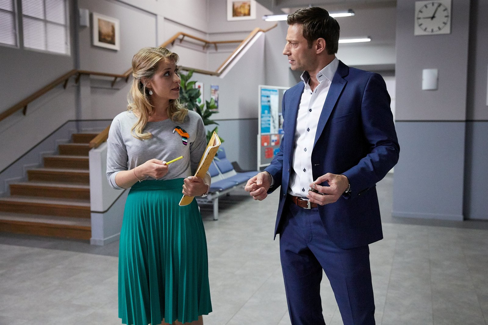 Ein Vater kommt selten alleinIm Kommissariat angekommen, erfährt Kommissar Hansen (Igor Jeftic, r.) von Christin Lange (Sarah Thonig, l.) dass Pathologin Sandra Mai Neuigkeiten für ihn hat.Bild: © Bojan Ritan / Die Verwendung ist nur bei redak / ZDF / © ZDF/Bojan Ritan