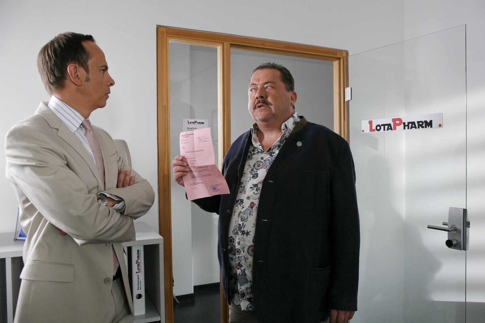 Mord auf RatenRosenheim-Cop Korbinian Hofer (re. Joseph Hannesschläger) konfrontiert Bernd Schelling (li. Moritz Lindbergh) mit den neuesten Ermittlungsergebnissen.Bild: © ZDF und Christian A. Rieger