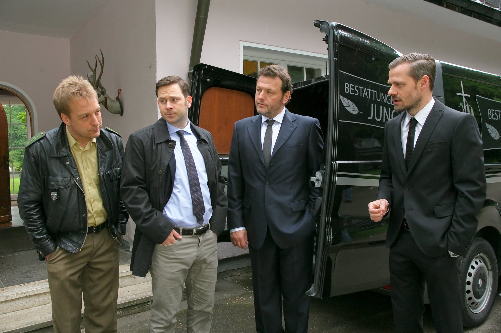 Der König kommtKommissar Königs (Mark-Alexander Solf, 2.v.l.) erster Fall führt ihn und Polizist Michi Mohr (Max Müller, l.) zu Bestattungsunternehmer Jung (Martin Muliar, 2.v.r.; Sven Waasner, r.).Bild: © ORF2