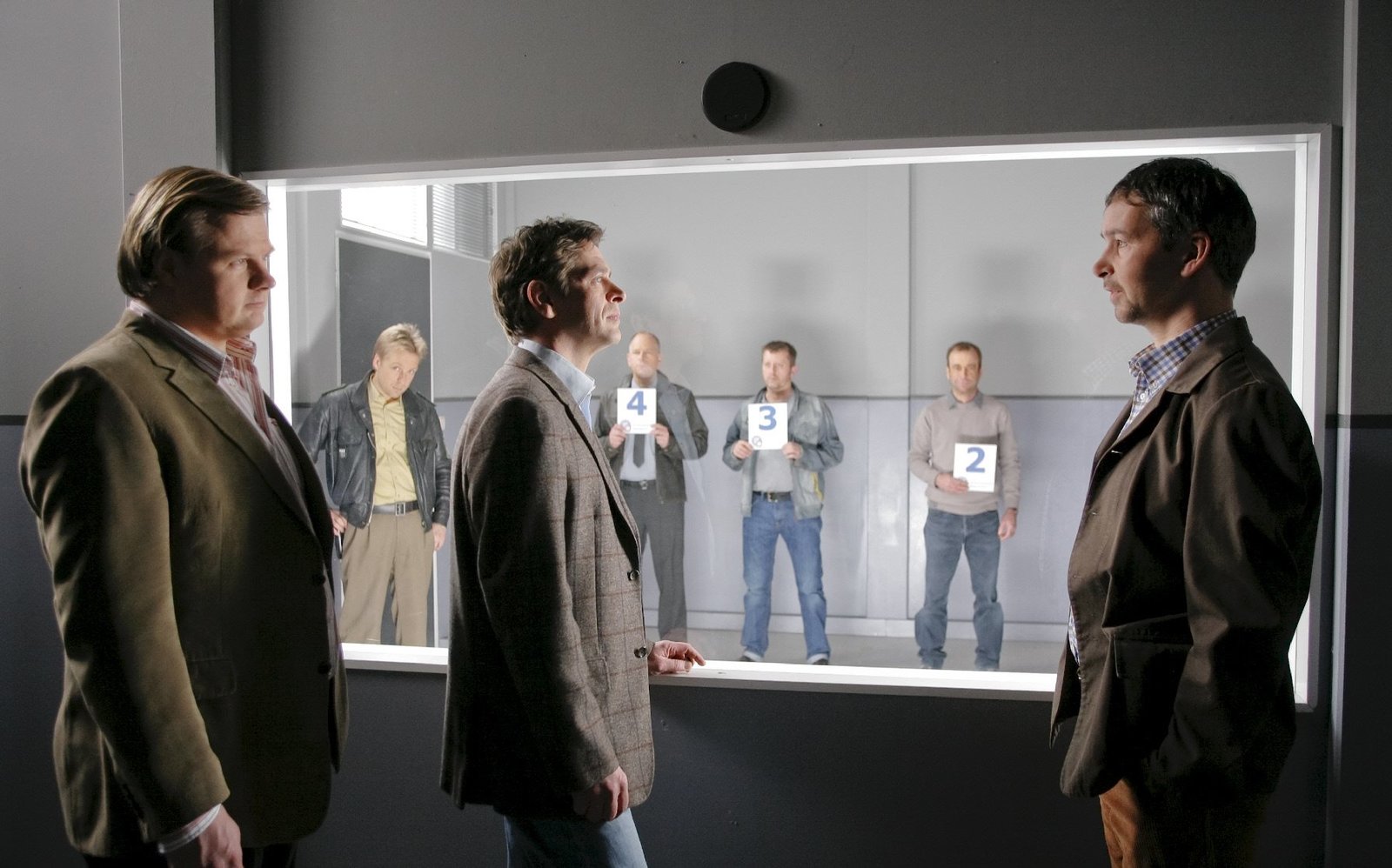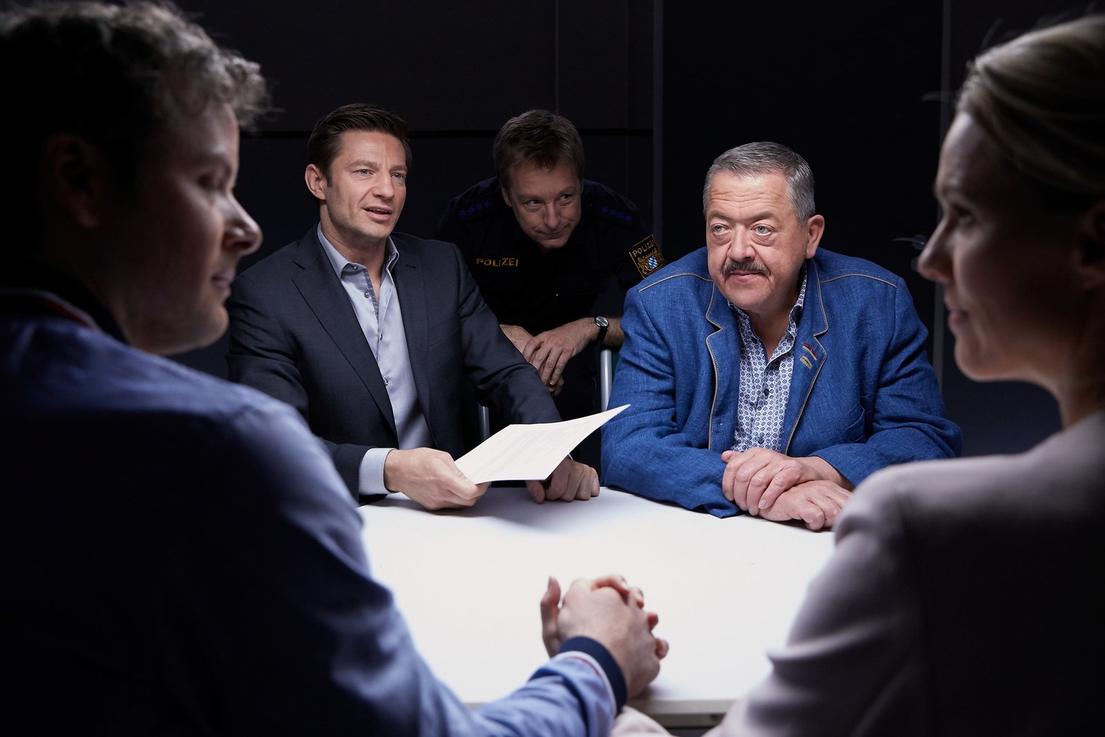 Ein Schuss in der NachtBei der Gegenüberstellung stellen die Kommissare Tobias Hartl und Christian Lind dem verdächtigen Herbert Bräuninger eine Falle. (v.l.n.r.: Michael A.Grimm), Max Müller, Tom Mikulla, Thomas Dannemann)Bild: © ZDF und Christian A. Rieger
