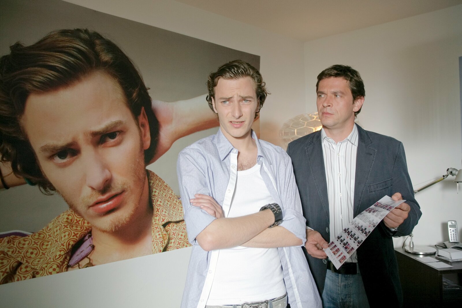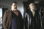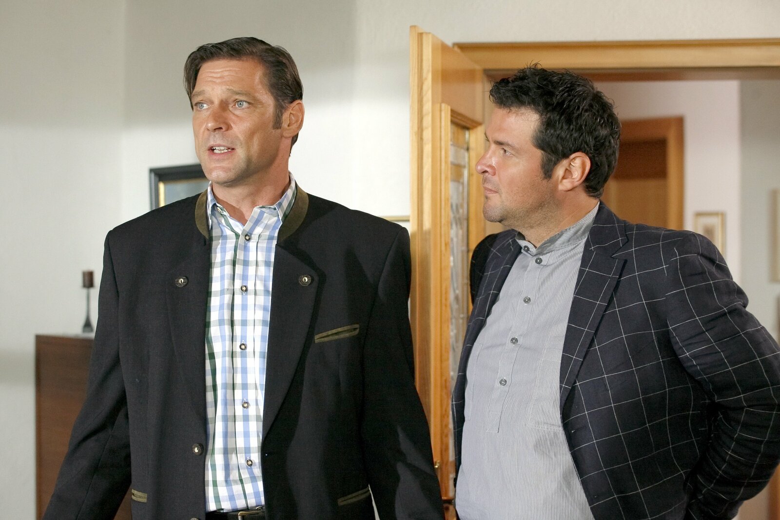 Jo unter VerdachtWerner Waidlinger (Manfred Stücklschwaiger, l.) bestätigt, dass Jo Caspar (Christian K.Schaeffer) ihn am Abend zuvor betrunken nach Hause geschafft hat, - soweit er sich erinnern kann.Bild: © ORF 2
