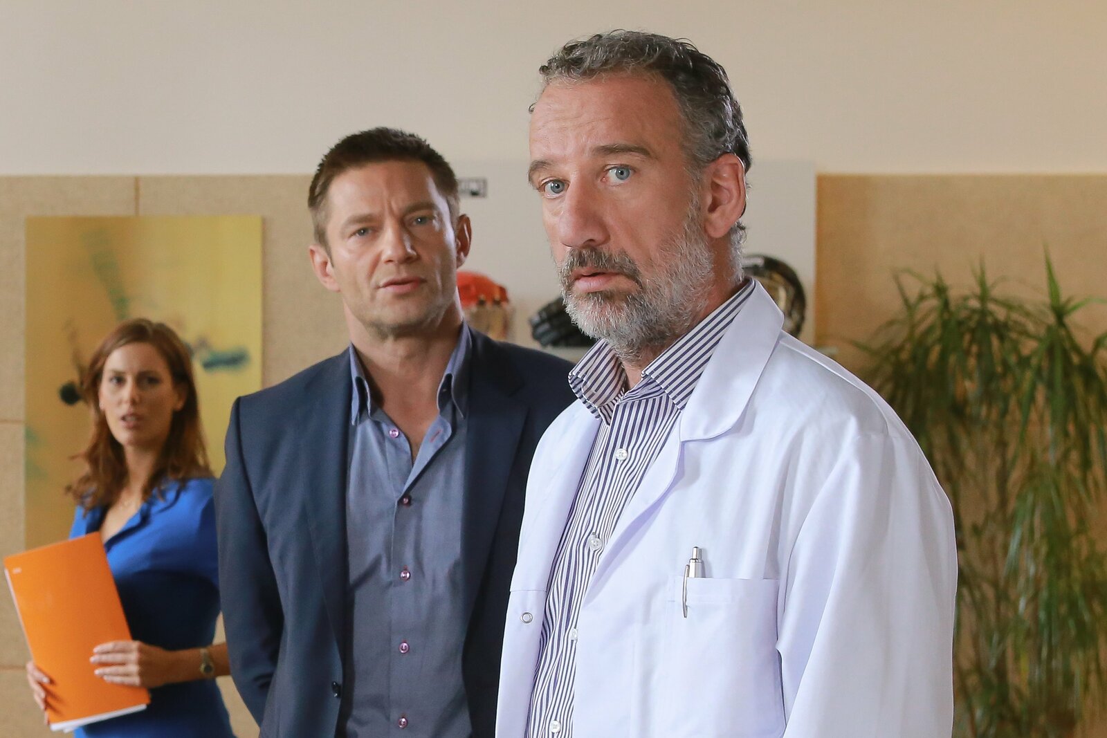 Selbst ist die FrauDas Opfer wollte die Gemeinschaftspraxis mit Dr. Behring (Heio von Stetten, r.) und Julia Stemmer (Katharina Schwarzmaier, l.) zugunsten einer eigenen Praxis verlassen. Hansen (Igor Jeftic, M.) glaubt, dass der Arzt daraufhin zugeschlagen hat.Bild: © ORF/ZDF/Christian A. Rieger