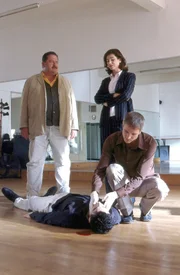 Salsa in den TodDie beiden Cops Korbinian Hofer (Josef Hannesschläger, l.) und Ulrich Satori (Markus Böker) mit der Pathologin Dr. Kern (Maren Schumacher) am Tatort in der Tanzschule Prinz, in der Tanzlehrer Rocco erschlagen aufgefunden wurde.Bild: © ORF 2