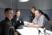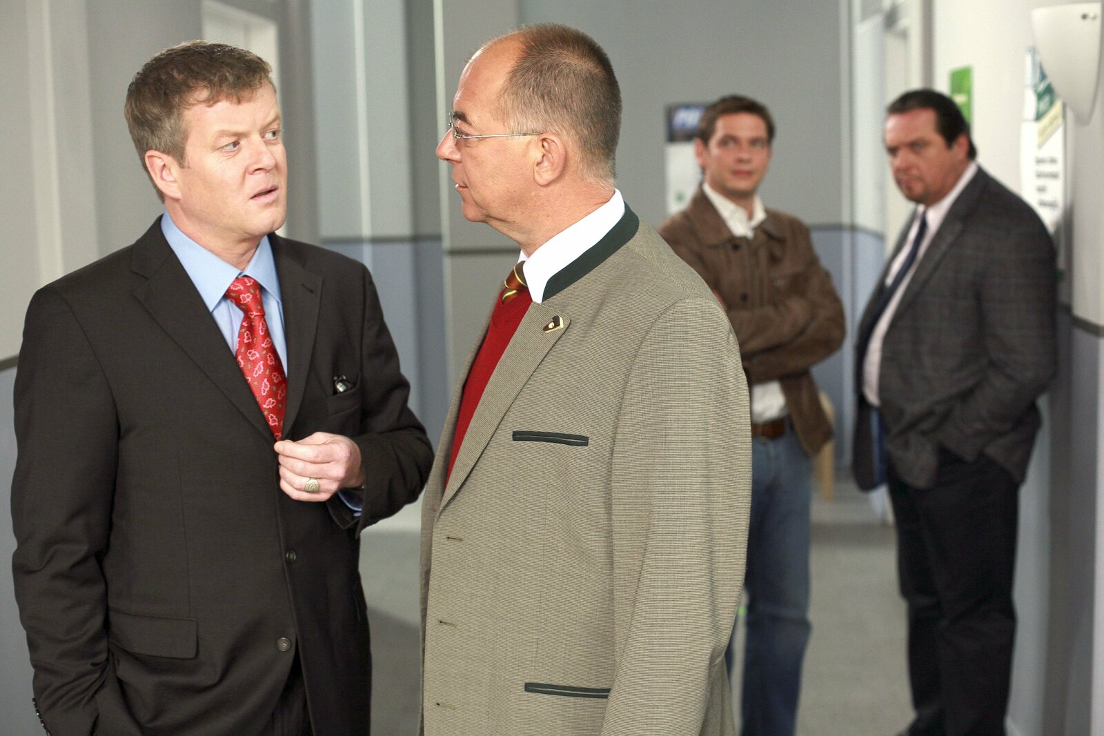 Mord im RosenbeetAnwalt Justus Rieger (Michael Schiller, li.) tut sich mit seiner überheblichen Drohung keinen Gefallen, denn bei Polizeichef Gert Achziger (Alexander Duda, 2.v.li.) beisst er damit auf Granit, wie Florian Prantl (Andreas Giebel, re.) und Christian Lind (Tom Mikulla) amüsiert feststellen.Bild: © ORF/ZDF/Christian A. Rieger
