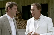 Reiche Säcke, arme SchweineDurch den Mord an seinem Bruder wird Karl Herburger (Robert Giggenbach, r.) Erbe eines beträchtlichen Vermögens, aber dennoch hat er auch ohne Alibi gegenüber Rosenheim-Cop Christian Lind (Tom Mikulla) nicht das Gefühl, sich verteidigen zu müssen.Bild: © ORF 2