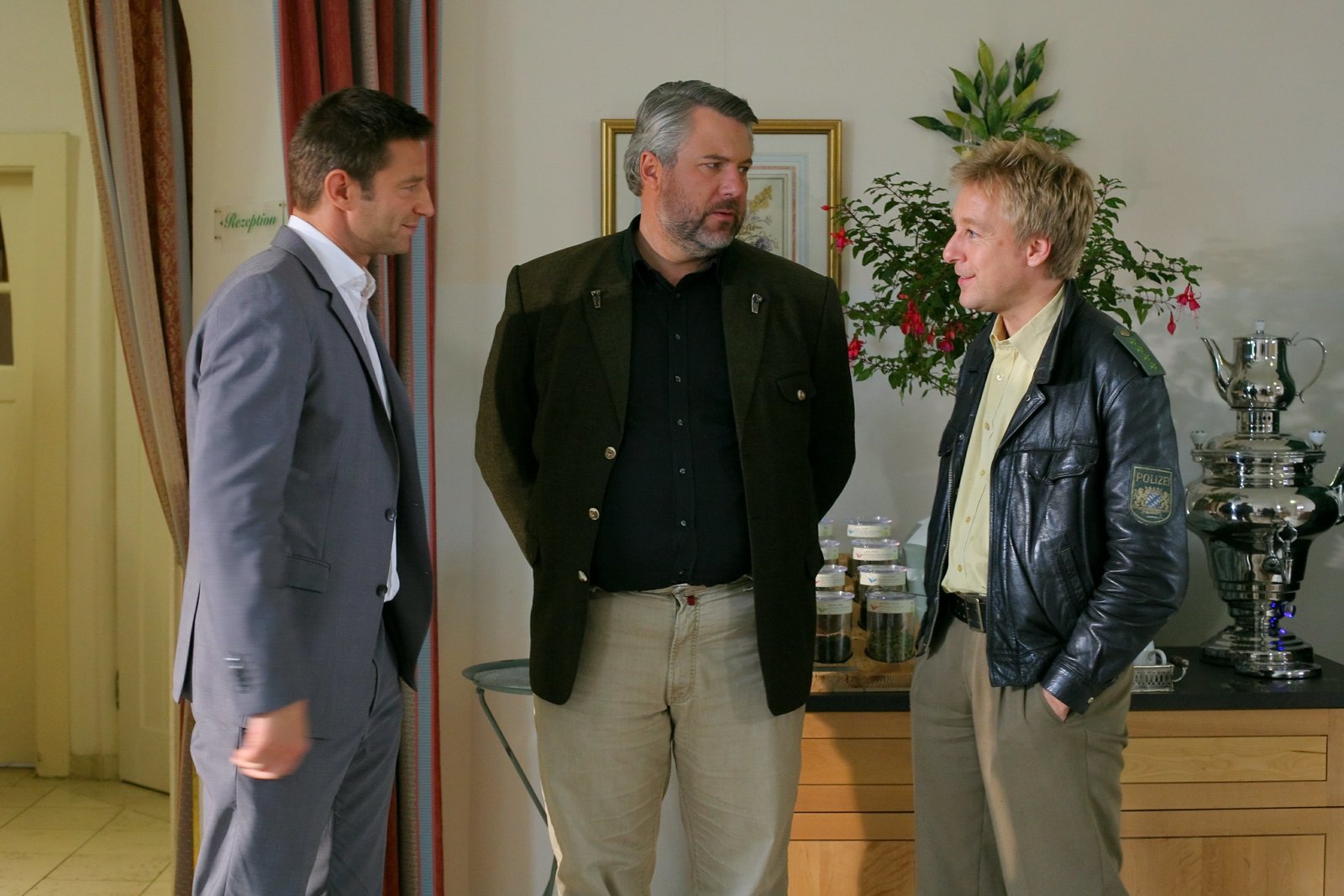 Rosenheimer GeheimnisseDie Rosenheim-Cops Hofer (Joseph Hannesschläger, l.), Mohr (Max Müller, 2.v.l.) und Hansen (Igor Jeftic, 2.v.r.) ermitteln und befragen Gastronom Reiter (Manou Lubowski, r.).Bild: © ZDF und Christian A. Rieger - klick