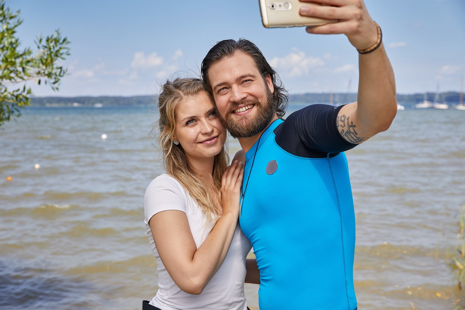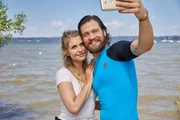 Bretter, die die Welt bedeutenJulian Trautmann (Patrick G. Boll, r.) und Christin Lange (Sarah Thonig, l.) stehen am Ufer des Grundstücks, auf dem Julian seinen mobilen Surfbrettverleih eröffnen will, und genießen den unbeschwerten Augenblick.Bild: © ZDF und Bojan Ritan.