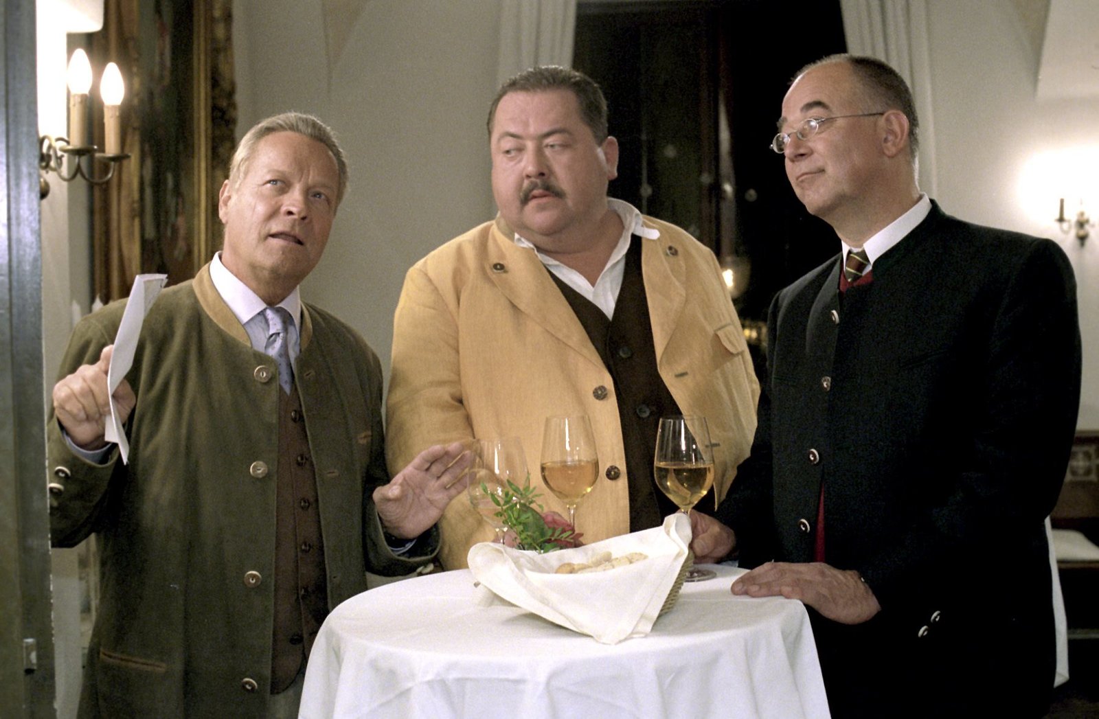 Ein mörderischer AbgangRestaurantchef Ludwig Krammler (Fritz von Friedl, l.) erläutert seine hochtrabenden Pläne, was Polizeichef Gert Achtziger (Alexander Duda, r.) mit Interesse, Rosenheim-Cop Korbinian Hofer (Joseph Hannesschläger) mit Skepsis verfolgt.Bild: © ORF 2