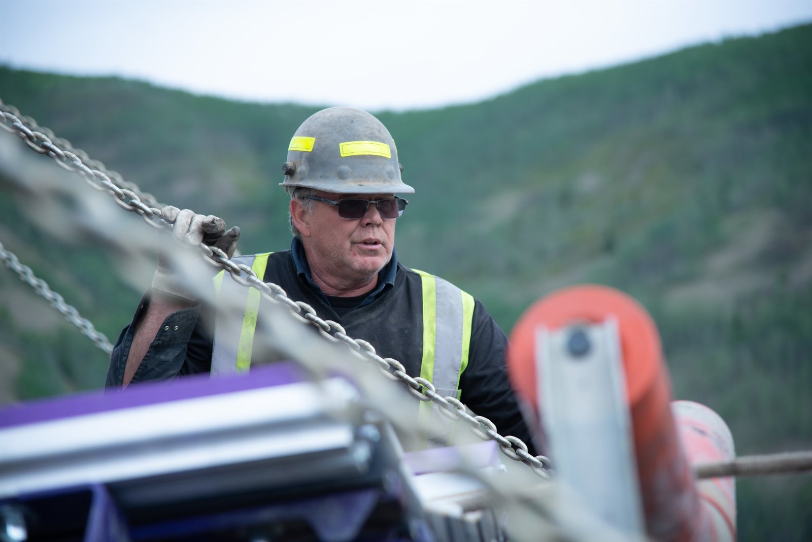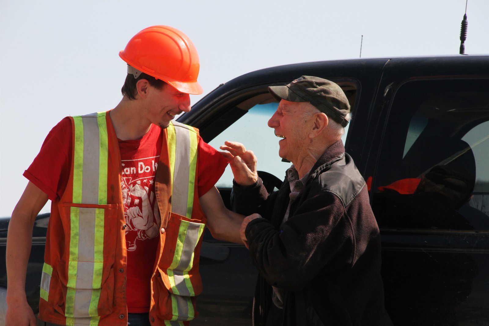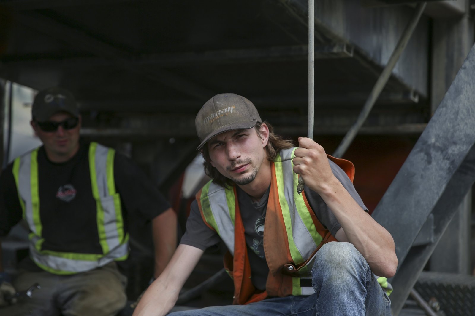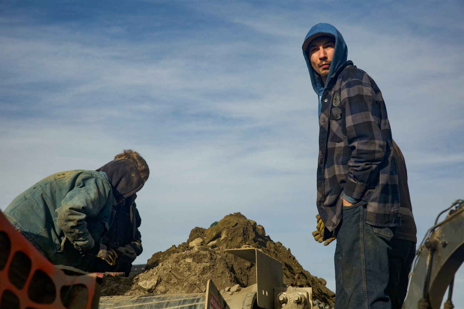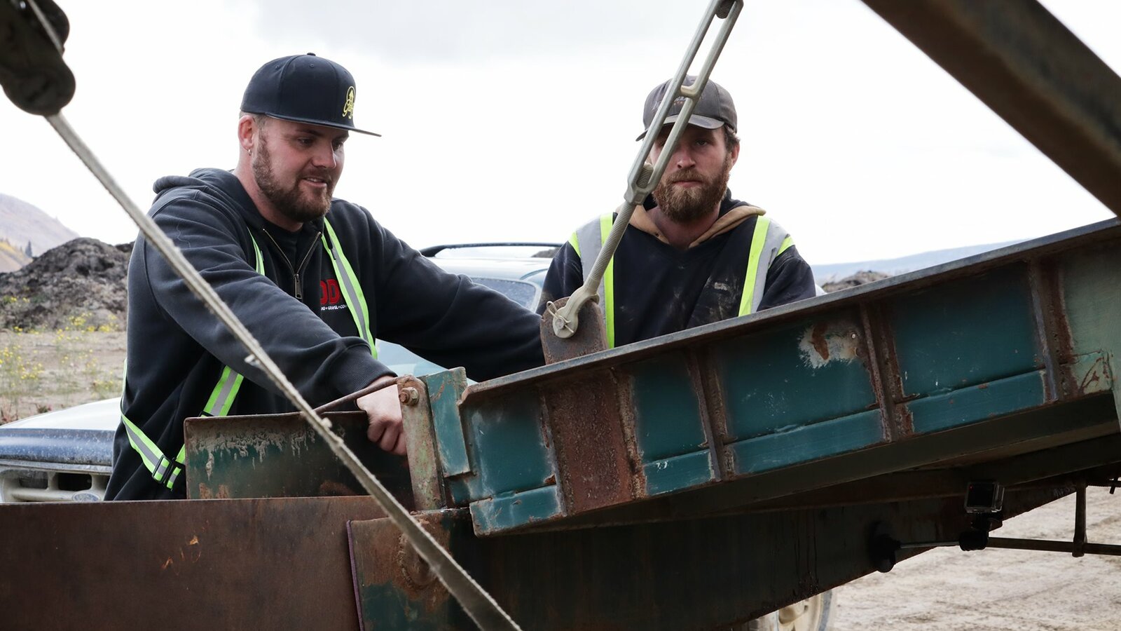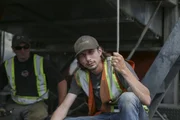 Ein verlässlicher VaterParker in orange hoodie helping fix a rock truck.Bild: © Discovery Communications