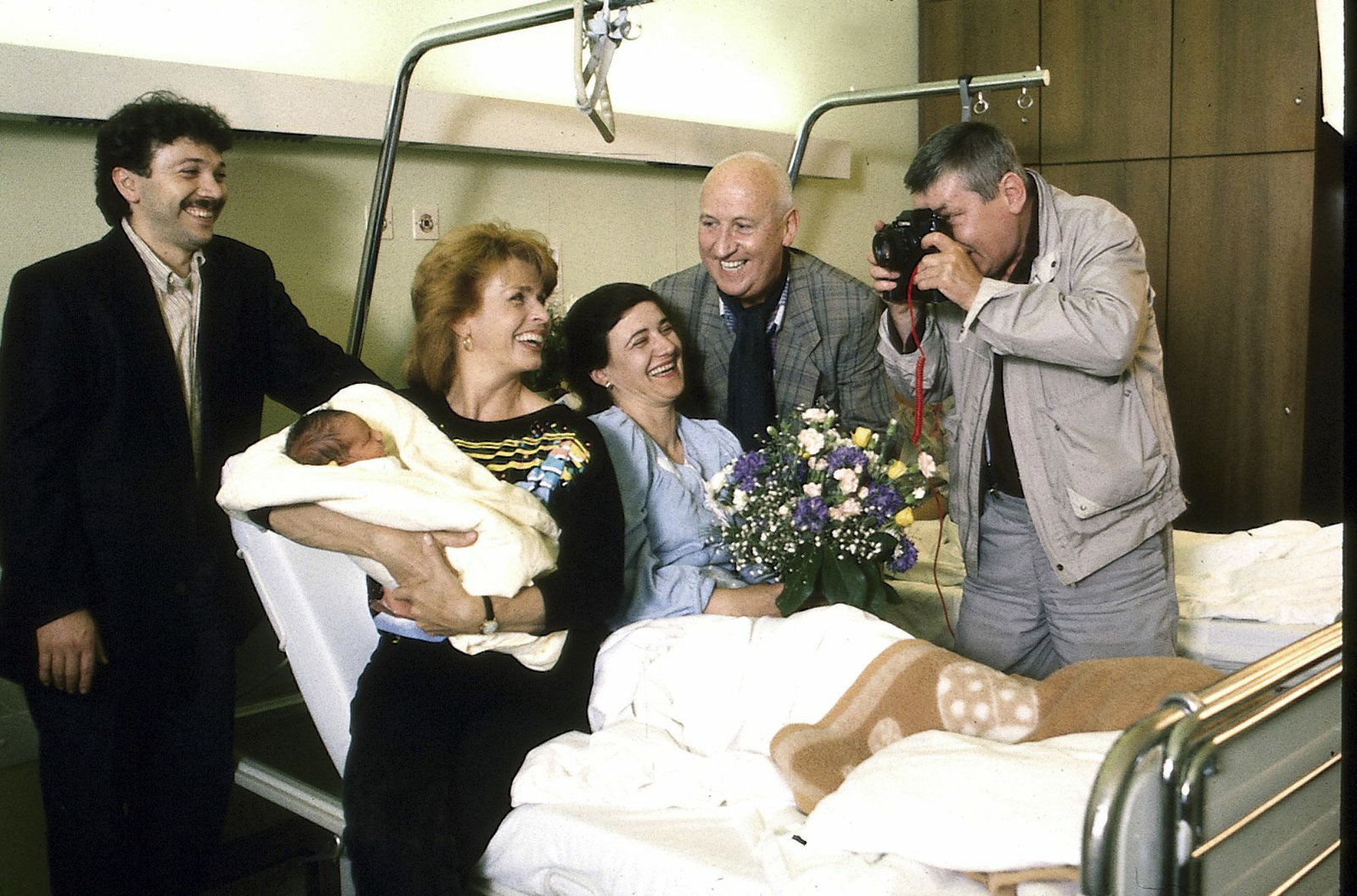Heldin des TagesMit dem Baby, das in ihrem Taxi zur Welt kam, und mit den glücklichen türkischen Eltern posiert Gerdi für zwei Boulevard-Journalisten. (V.l.: Yekta Özkaya, Senta Berger, Enise Özkaya, Karl Lieffen, Peter Thom).Bild: © ORF III