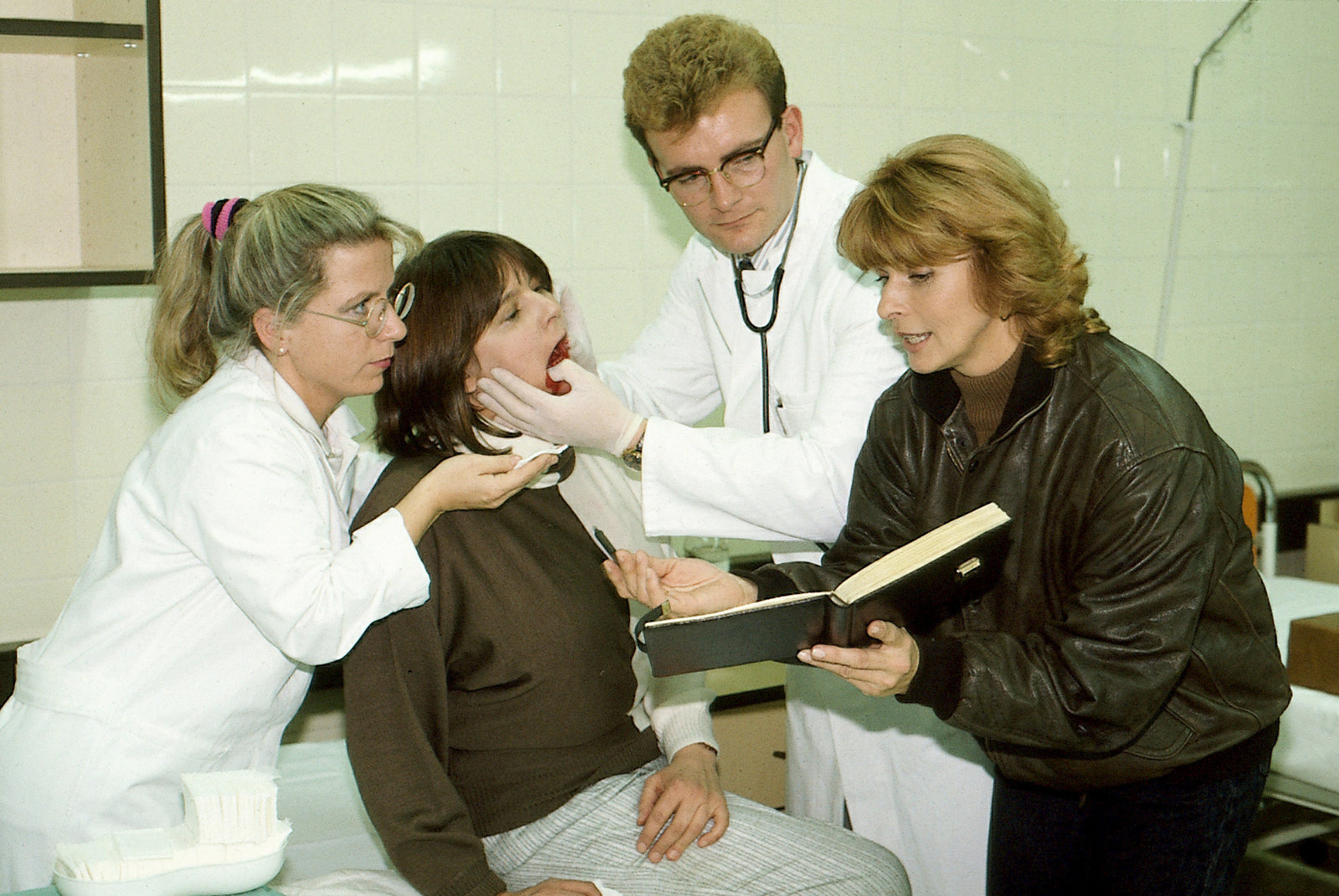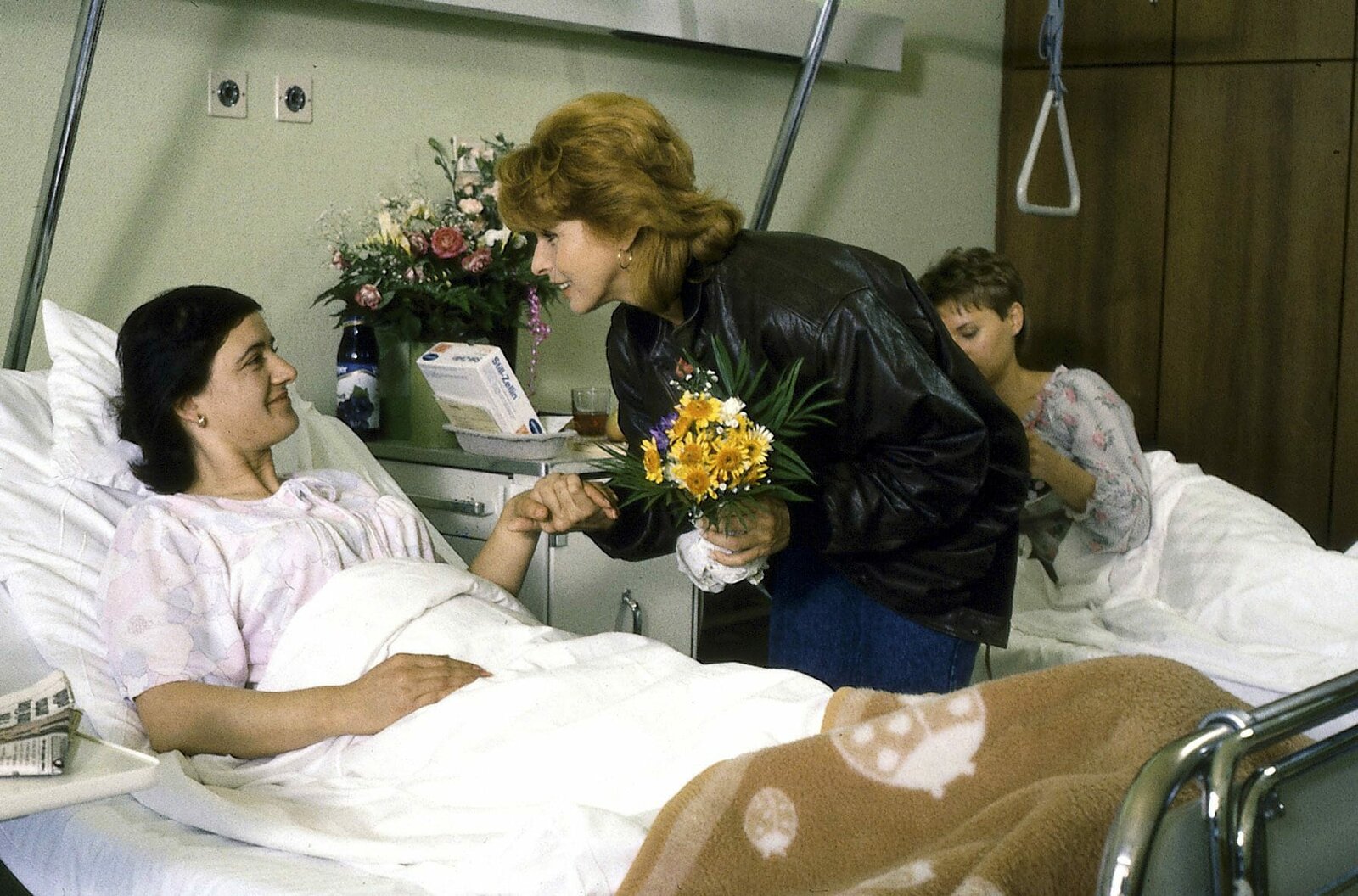 Gutes neues JahrBeim Autogramm-Sammeln ist Gerdi (Senta Berger, r.) unerbittlich, auch in unmöglichen Situationen. Die verletzte Abgeordnete, Frau Dr. von Hohenstein-Büchsel (Maria Peschek, 2.v.l.), die von Gerdi zum Arzt chauffiert wurde, soll sich schnell noch ins Album eintragen.Bild: © ORF III