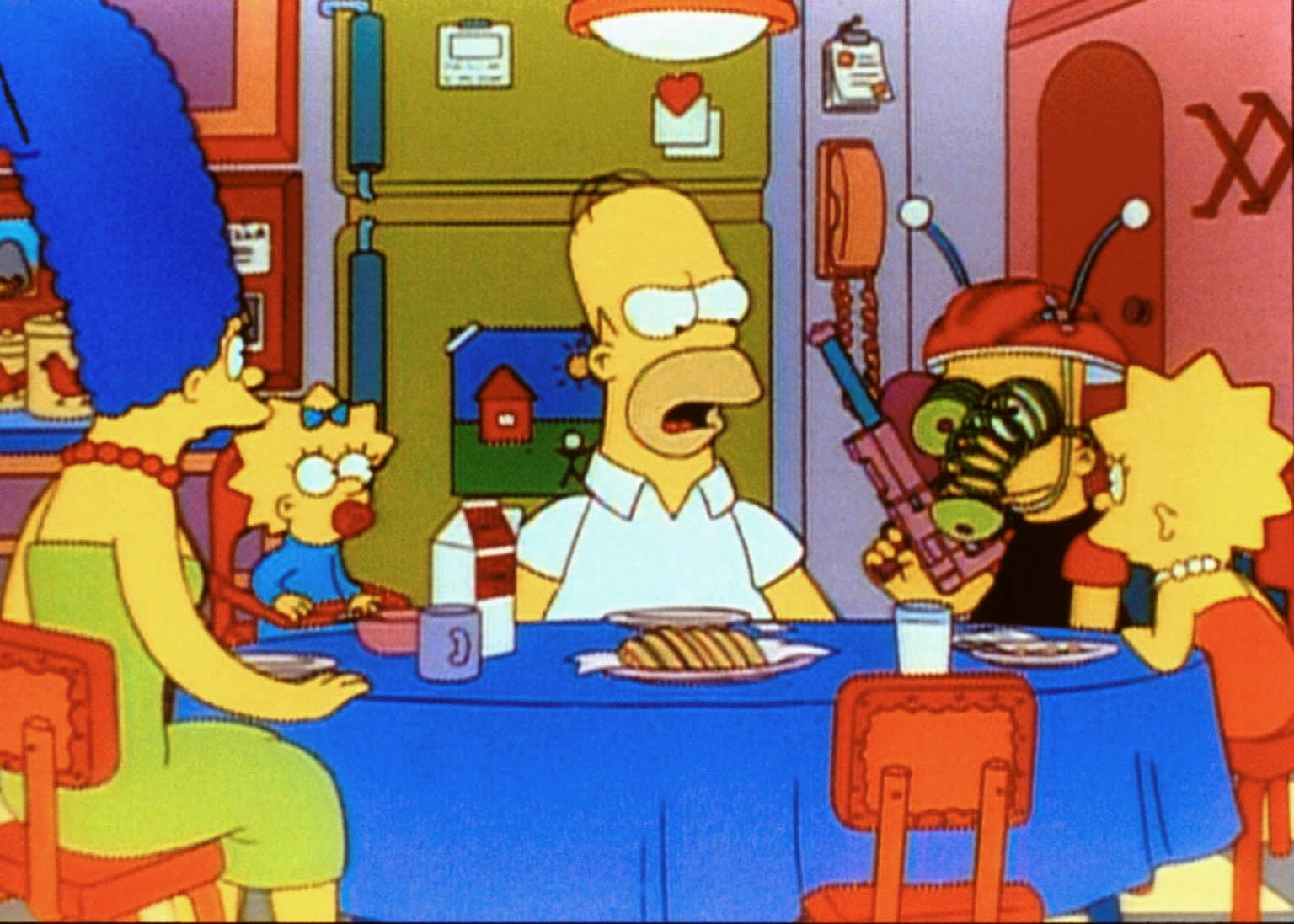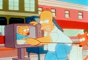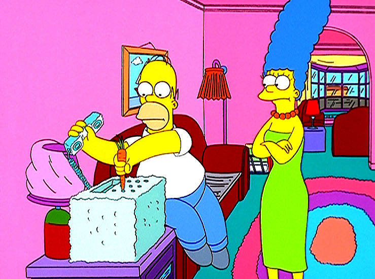 Szenen einer EheLisas neue Mitschülerin Francine fällt vor allem durch ihre extreme Aggressivität auf. Lisa findet heraus, dass dies eine Reaktion auf die Schweißausdünstung intelligenterer Menschen ist. Sie entwickelt ein Gegenmittel und erntet damit große Anerkennung. Im Bild: Marge kann es nicht fassen: Aus Sicherheitsgründen hat Homer das Telefon in Beton gegossen und muss die Tastatur nun mit einer Möhre bedienen.Bild: © ORF/Kirch Med