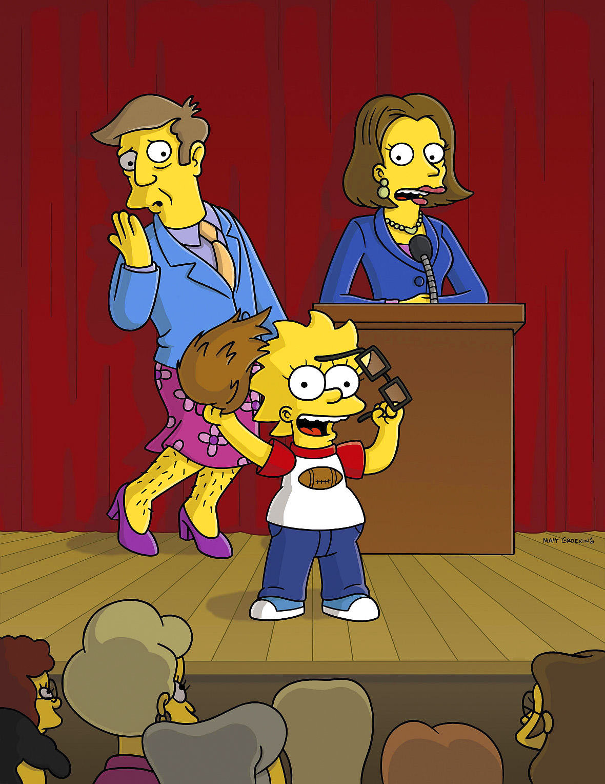 Gleichung mit einem UnbekanntenDie Simpsons "Gleichung mit einem Unbekannten". Rektor Skinner lässt mit einem sexistischen Kommentar aufhorchen und wird als Konsequenz von einer Frau in seinem Amt als Schuldirektor abgelöst. Als erste Maßnahme veranlasst Rektorin Upfoot eine Geschlechtertrennung. Von nun an gibt es reine Burschen- und Mädchenklassen. Lisa langweilt der Matheunterricht, der ihr und ihren Mitschülerinnen vorgesetzt wird. Heimmlich nimmt sie von nun an am Unterricht der Burschen teil.Bild: © ORF/-. Andere Verwendung