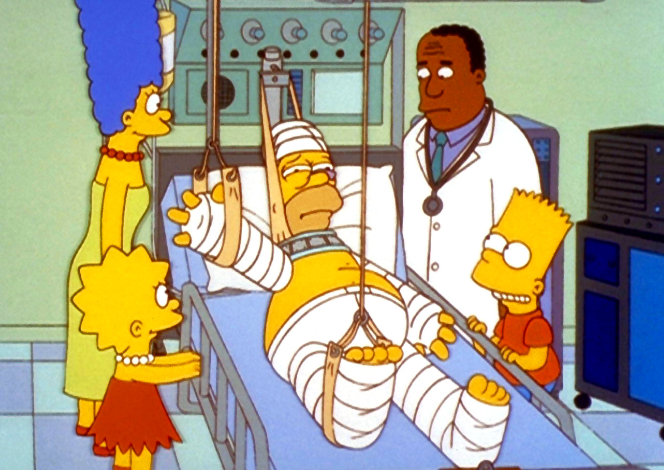 Grandpas Nieren explodierenAls Homer (Mi.) einen schweren Autounfall hat, nimmt ihm Dr. Hibbert (2.v.re.) auch gleich die Spenderniere für seinen Vater heraus.Bild: © PR7; ProSieben Media AG