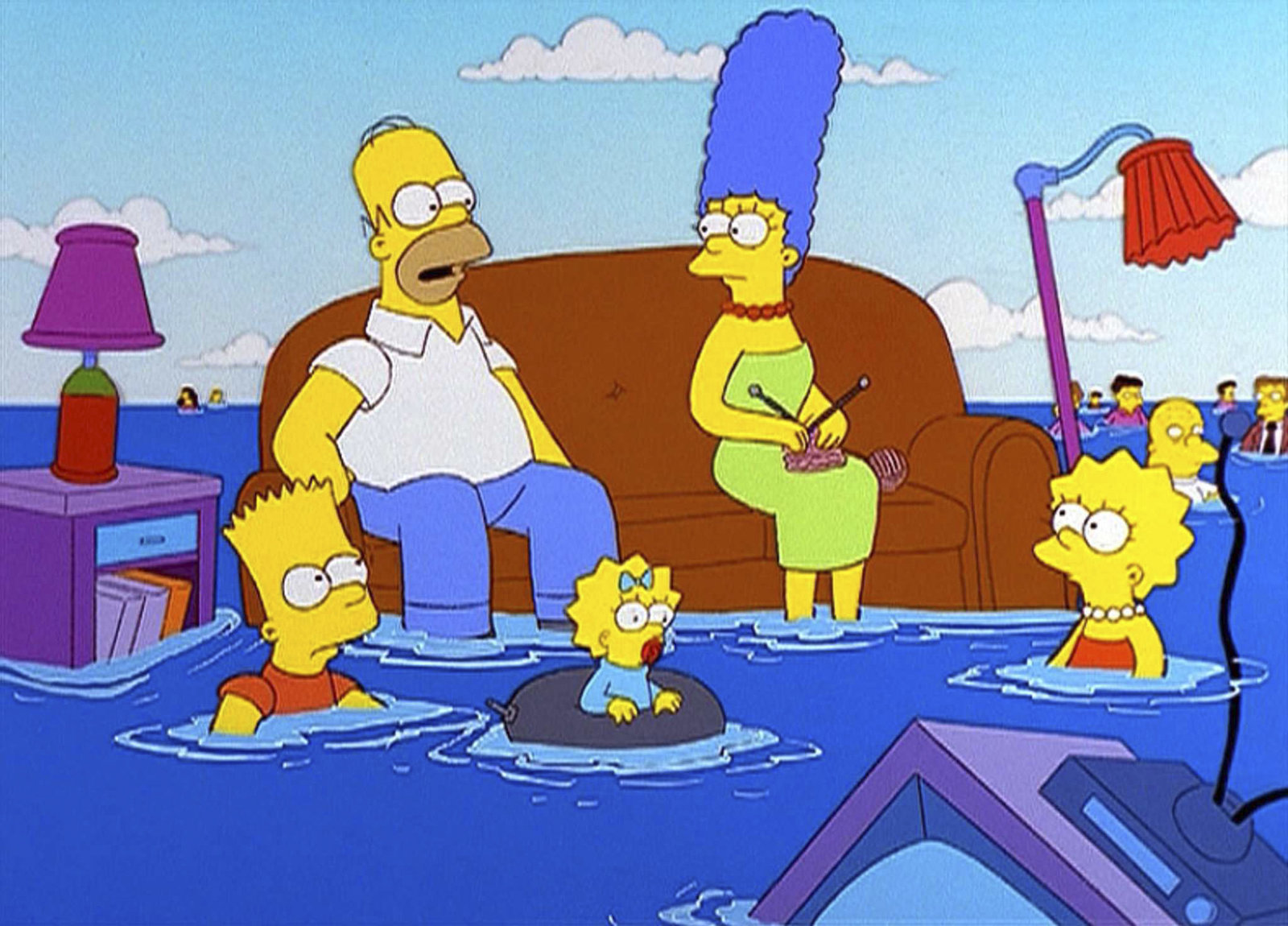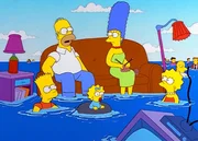 D-D-Der G-G-Geister D-D-DadDie Simpsons "D-D-Der G-G-Geister D-D-Dad". Im Bild: Von Delphinen verjagt, landen Homer (hinten l.), Marge (hinten r.), Bart, Maggie und Lisa Simpson (vorne, v.l.n.r.) und die anderen Einwohner Springfields im Meer.Bild: © ORF/-. Andere Verwendung