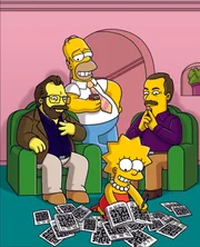 Das Kreuz mit den WorträtselnMit Hilfe von Rätselbauer Merl Reagle (l.) und dem Herausgeber der New York Times-Kreuzworträtsel, Will Shortz (r.), hat Homer (2.v.l.) eine versteckte Botschaft für Lisa (2.v.r.) vorbereitet.Bild: © Puls 8
